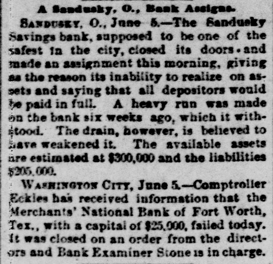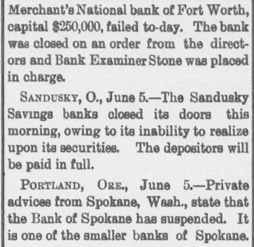 Merchant's National bank of Fort Worth, capital $250,000, failed to-day. The bank was closed on an order from the directors and Bank Examiner Stone was placed in charge. SANDUSKY, O., June 5.-The Sandusky Savings banks closed its doors this morning, owing to its inability to realize upon its securities. The depositors will be paid in full. PORTLAND, ORE., June 5.-Private advices from Spokane, Wash., state that the Bank of Spokane has suspended. It is one of the smaller banks of Spokane.