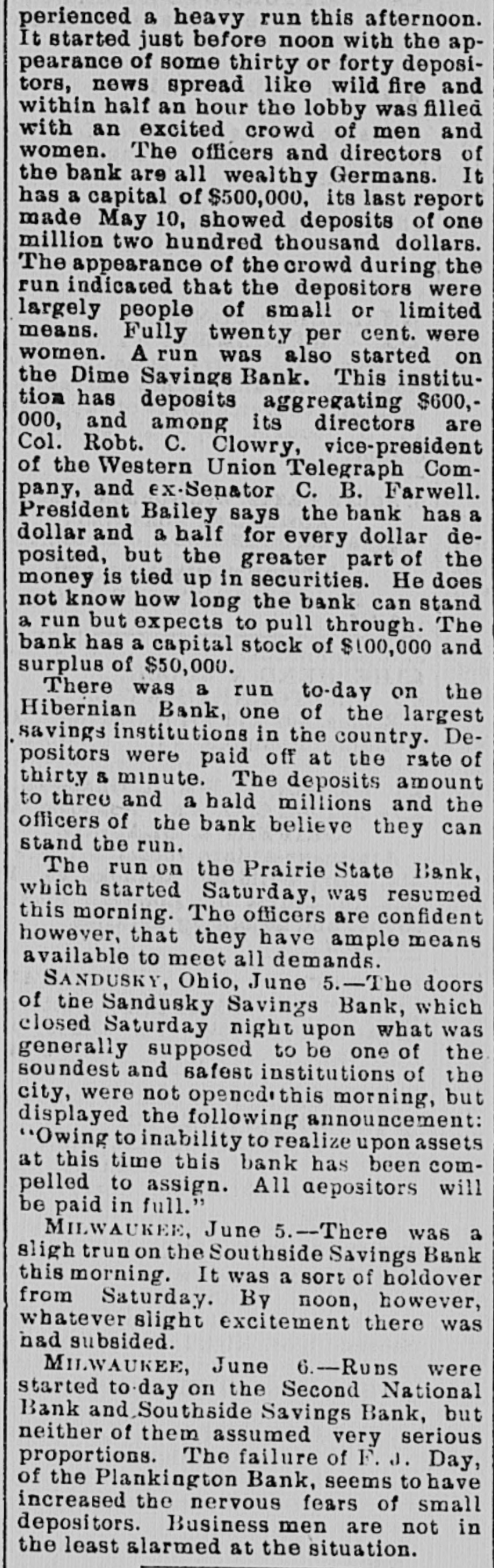perienced a heavy run this afternoon. It started just before noon with the ap- pearance of some thirty or forty deposi- tors, news spread like wild fire and within half an hour the lobby was filled with an excited crowd of men and women. The officers and directors of the bank are all wealthy Germans. It has a capital of $500,000, its last report made May 10, showed deposits of one million two hundred thousand dollars. The appearance of the crowd during the run indicated that the depositors were largely people of small or limited means. Fully twenty per cent. were women. A run was also started on the Dime Savings Bank. This institu- tion has deposits aggregating $600,- 000, and among its directors are Col. Robt. C. Clowry, vice-president of the Western Union Telegraph Com- pany, and ex-Senator C. B. Farwell. President Bailey says the bank has a dollar and a half for every dollar de- posited, but the greater part of the money is tied up in securities. He does not know how long the bank can stand a run but expects to pull through. The bank has a capital stock of $100,000 and surplus of $50,000. There was a run to-day on the Hibernian Bank, one of the largest savings institutions in the country. De- positors were paid off at the rate of thirty a minute. The deposits amount to three and a hald millions and the officers of the bank believe they can stand the run. The run on the Prairie State Bank, which started Saturday, was resumed this morning. The officers are confident however, that they have ample means available to meet all demands. SANDUSKY, Ohio, June 5.-The doors of the Sandusky Savings Bank, which closed Saturday night upon what was generally supposed to be one of the soundest and safest institutions of the city, were not opened this morning, but displayed the following announcement: "Owing to inability to realize upon assets at this time this bank has been com- pelled to assign. All aepositors will be paid in full." MILWAUKEE, June 5.--There was a sligh trun on the Southside Savings Bank this morning. It was a sort of holdover from Saturday. By noon, however, whatever slight excitement there was nad subsided. MILWAUKEE, June 6.--Runs were started to-day on the Second National Bank and Southside Savings Bank, but neither of them assumed very serious proportions. The failure of F. J. Day, of the Plankington Bank, seems to have increased the nervous fears of small depositors. Business men are not in the least alarmed at the situation.