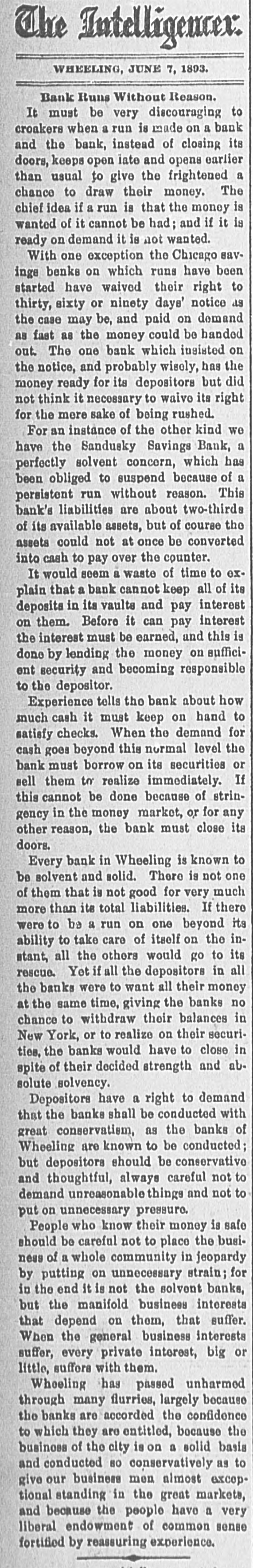 The Intelligencer. WHEELING, JUNE 7, 1893. Bank Runs Without Reason. It must be very discouraging to croakers when a run is made on a bank and the bank, instead of closing its doors, keeps open iate and opens earlier than usual to give the frightened a chance to draw their money. The chief idea if a run is that the money is wanted of it cannot be had; and if it is ready on demand it is not wanted. With one exception the Chicago savinge benks on which runs have been started have waived their right to thirty, sixty or ninety days' notice as the case may be, and paid on domand as fast as the money could be handed out. The one bank which insisted on the notice, and probably wisely, has the money ready for its depositors but did not think it necessary to waive its right for the more sake of being rushed. For an instance of the other kind we have the Sandusky Savings Bank, a perfectly solvent concern, which has been obliged to suspend because of a persistent run without reason. This bank's liabilities are about two-thirds of its available assets, but of course the assets could not at once be converted into cash to pay over the counter. It would seem a waste of time to explain that a bank cannot keep all of its deposits in its vaults and pay interest on them. Before it can pay interest the interest must be earned, and this is done by lending the money on sufficient security and becoming responsible to the depositor. Experience tells the bank about how much cash it must keep on hand to satisfy checks. When the demand for cash goes beyond this normal level the bank must borrow on its securities or sell them tn realize immediately. If this cannot be done because of stringency in the money market, or for any other reason, the bank must close its doors. Every bank in Wheeling is known to be solvent and solid. There is not one of them that is not good for very much more than its total liabilities. If there were to be a run on one beyond its ability to take care of itself on the instant, all the others would go to its rescue. Yet if all the depositors in all the banks were to want all their money at the same time, giving the banks no chance to withdraw their balances in New York, or to realize on their securities, the banks would have to close in spite of their decided strength and absolute solvency. Depositors have a right to demand that the banks shall be conducted with great conservatism, as the banks of Wheeling are known to be conducted: but depositors should be conservative and thoughtful, always careful not to demand unreasonable things and not to put on unnecessary pressure. People who know their money is safe should be careful not to place the business of a whole community in jeopardy by putting on unnecessary strain; for in the end it is not the solvent banks, but the manifold business interests that depend on them, that suffer. When the general business interests suffer, every private interest, big or little, suffere with them. Wheeling has passed unharmed through many flurries, largely because the banks are accorded the confidence to which they are entitled, because the business of the city is on a solid basis and conducted SO conservatively as to give our business men almost exceptional standing in the great markets, because the people have and a very liberal endowment of common sense fortified by reassuring experience.