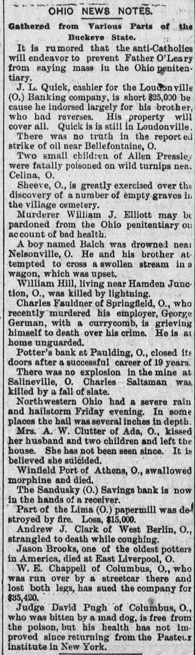 OHIO NEWS NOTES. Gathered from Various Parts of the Buckeye State. It is rumored that the anti-Catholics will endeavor to prevent Father O'Leary from saying mass in the Ohio penitentiary. J. L. Quick, cashier for the Loudon ville (O.) Banking company, is short $25,000 be cause he indorsed largely for his brother, who had reverses. His property will cover all. Quick is is still in Loudonville. There was no truth in the report ed strike of oil near Bellefontaine, O. Two small children of Allen Pressley were fatally poisoned on wild turnips nea. Celina, O. Sheeve, O., is greatly exercised over the discovery of a number of empty graves in the village cemetery. Murderer William J. Elliott may be pardoned from the Ohio penitentiary on account of bad health. A boy named Balch was drowned neal Nelsonville, O. He and his brother at tempted to cross a swollen stream in a wagon, which was upset. William Hill, living near Hamden Junction, O., was killed by lightning. Charles Fauldner of Springfield, O., who recently murdered his employer, George German, with a currycomb, is grieving himself to death over his crime. He is at home unguarded. Potter's bank at Paulding, O., closed its doors after a successful career of 19 years. There was no explosion in the mine at Salineville, O. Charles Saltsman was killed by a fall of slate. Northwestern Ohio had a severe rain and hailstorm Friday evening. In some places the hail was several inches in depth. Mrs. A. W. Clutter of Ada, O., kissed her husband and two children and left the house. She has not been seen since. It is believed she suicided. Winfield Port of Athens, O., swallowed morphine and died. The Sandusky (O.) Savings bank is now in the hands of a receiver. Part of the Lima (O.) papermill was de stroyed by fire. Loss, $15,000. Andrew J. Clark of West Berlin, O., strangled to death while coughing. Jason Brooks, one of the oldest potters in America, died at East Liverpool, O. W. E. Chappell of Columbus, O,, who was run over by a streetcar there and lost both legs, has sued the company for $35,420. Judge David Pugh of Columbus, O., who was bitten by a mad dog, is free from the poison, but his health has not improved since returning from the Pasteur institute in New York.