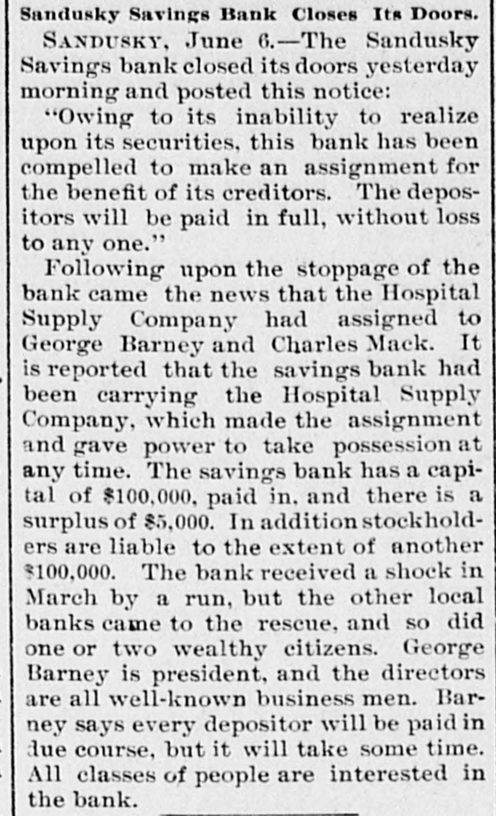 Sandusky Savings Bank Closes Its Doors. SANDUSKY, June -The Sandusky Savings bank closed its doors yesterday morning and posted this notice: "Owing to its inability to realize upon its securities, this bank has been compelled to make an assignment for the benefit of its creditors. The depositors will be paid in full, without loss to any one." Following upon the stoppage of the bank came the news that the Hospital Supply Company had assigned to George Barney and Charles Mack. It is reported that the savings bank had been carrying the Hospital Supply Company, which made the assignment and gave power to take possession at any time. The savings bank has a capital of $100,000, paid in. and there is a surplus of $5,000. In addition stockholders are liable to the extent of another $100,000. The bank received a shock in March by a run, but the other local banks came to the rescue, and so did one or two wealthy citizens. George Barney is president, and the directors are all well-known business men. Barney says every depositor will be paid in due course, but it will take some time. All classes of people are interested in the bank.
