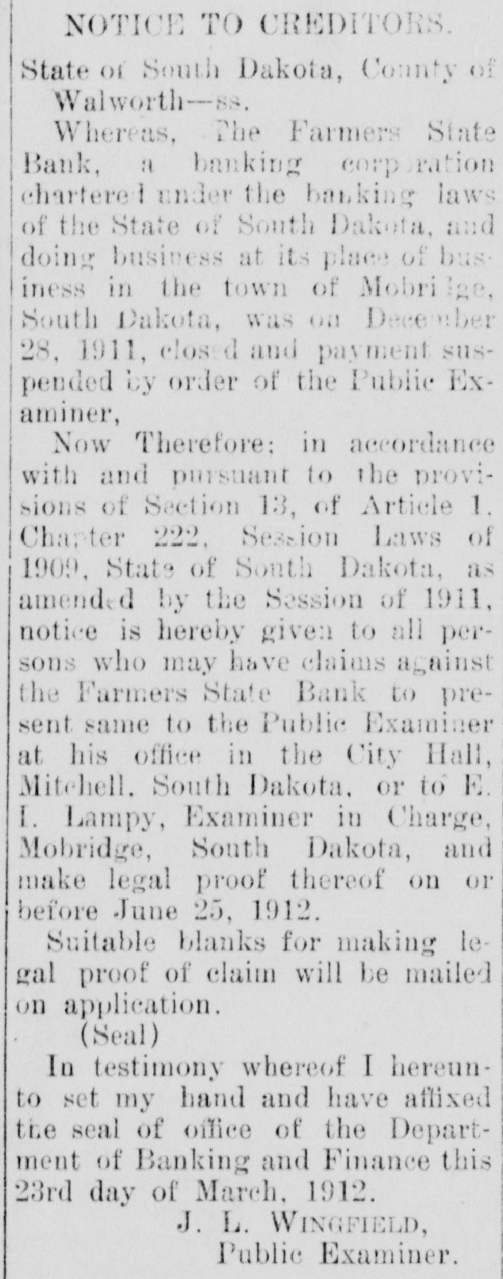 LOCAL NEWS AND COMMENT G. B. Thomas was over from State's Attorney E. B. Adams ranch near Glenham Tuesday. of Java, was a Mobridge visitor Tuesday. Attorney W. M. Potts is absent Anyone wanting washing or from the city on professional busiother housework done by the day, at points east of here. call at James Ritchey's. Hon. Geo. H. Hoffman, of LowJ. W. Harris made a short buswas a Mobridge visitor again iness trip to MeIntosh and MorrisTuesday of this week. town on Wednesday of this week Mrs. A. C. Dykeman has been Mrs. J. F. Comstock returned quite ill for several days, but is Wednesday from a visit with nuch improved at this time. friends at points on the Cheyenne When purchasing coal, rememreservation. we can give you quality in any Mr. and Mrs Harry Hastings quantity. Bright-Webster Lumleft Tuesday night on a somewhat Co. extended trip to Seattle and other Ed Armstrong and Phillip ClayPacific coast points. more, of Cheyenne Junction, spent C. B. Little arrived last week the early part of the week in the from Cottonwood, this state, and e'ty. has accepted a position as pharmaA. H. Brown returned Sunday cist in Thos Church's drug store from an absence of six weeks, I have a number of lots in the which was spent at French Lick Northwest Townsite Company and and other Indiana points. the Main Park addition that I car I am prepared to do all kinds of sell at a bargain. M. T. Woods draying, hauling and moving. AlJohn Cooley, of McLaughlin let riding horses out by the hour or day. L. C. Hollenbeck. engineer on the Standing Rocl branch, was shaking hands with C. W. Boldt, the well-known his many friends in this city Wed Eagle Butte banker, was visiting nesday. with friends and attending to business matters in the city WedFurniture moved, stored o nesday. packed for shipment; empty kegs P. D. Kribs, register of the barrels, etc for sale. In fact United States land office at Timber anything in that line. L. C. Hol lenbeck. Lake, was in the city over last night on his way to Aberdeen for L. E. Pierce came up from Mo visit with his family. bridge Monday to fix up his house For Sale-All my household furand get settled again on the home niture, including good piano, stead. He found the plumbing stoves and may other articles, all bursted by the frost. -Isabel News first-class condition. Terms to George M. Comstock, of Mc responsible parties. Dr. J. E. Laughlin, visited with his parents Ekrem. in this city early in the week Delbert Gallett went to Mobridge Mr. Comstock was returning home Tuesday on business for the D. G. from a visit with friends nea Gallett Jewelry company, which Mound City. several branch stores at MoFarmers in the vicinity of Mo bridge and the trans-Missouri bridge who have not got their ountry.-Aberdeen News. seed or feed for spring, we would Mr. and Mrs. L. J. Edmundson like to have them call at our bank left last week on a trip to several as we may be of some assistance eastern points. They visited Minto you. Mobridge State Bank. neapolis, Milwaukee and Chicago, E. I. Lampy, receiver of the and at present are visiting with relatives and friends at What Farmers State Bank at Mobridge Cheer, Iowa. Friends in the city returned Saturday night for an have received cards from them over-Sunday visit with his family saying that they are having an inand will return to Mobridge to teresting and enjoyable trip. morrow morning. - Watertown Public Opinion. E. S. Ludlow, proprietor of a hotel at Timber Lake, spent Wed nesday in the Bridge City. Mr Ludlow was on his return home from the baliny climes of Florida where he had been spending the most severe portion of the winter A wild animal of some sort has been causing homesteaders in the vicinity of Skull But'e, Corson county, heavy losses of live stock The tracks of the animal lead to the belief that it is a mountain KODAKS lion, and an expedition will be organized to hunt down the crea $2 to $30 ture. For the information of interest SPRING IS IN THE ed attorneys and others, Clerk of AIR Courts Holley, of Dewey county wishes The News to announce that "Kodak Time" Judge Carpenter will be in Tim ber Lake on Monday. March 4th Start now and let us show you at which time he will take up any the newest Kodaks. court matters which may be presented in chambers. The judge Full Line of Supplies is in a position to spend some AT time at Timber Lake, and is anx ious to get all court matters GALLETT'S cleaned up.