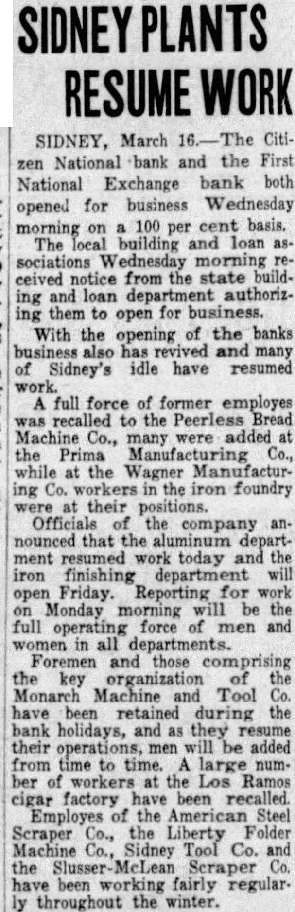 SIDNEY PLANTS RESUME WORK SIDNEY, March Citizen National bank and the First National Exchange bank both opened for business Wednesday morning on 100 per cent basis. The building and loan associations Wednesday morning ceived notice from the state building and loan department authorizing them to open for business. With the opening of the banks business also has revived and many of Sidney's idle have resumed work. full force of former employes was recalled to the Peerless Bread Machine Co., many were added at the Prima Manufacturing Co., while at the Wagner Manufacturing Co. workers the iron foundry at their positions. Officials of the company announced that the aluminum department resumed work today and the iron finishing department will open Friday. Reporting for work on Monday morning will be the full operating force of men women in all departments. Foremen and those comprising the key organization of the Monarch Machine and Tool Co. have been retained during the bank holidays, and as they resume their operations, men will be added from time to time. A large number of workers at the Los Ramos cigar factory have been recalled Employes of the American Steel Scraper Co., the Liberty Folder Machine Sidney Tool Co. and the Scraper Co. have fairly regularly throughout the winter.