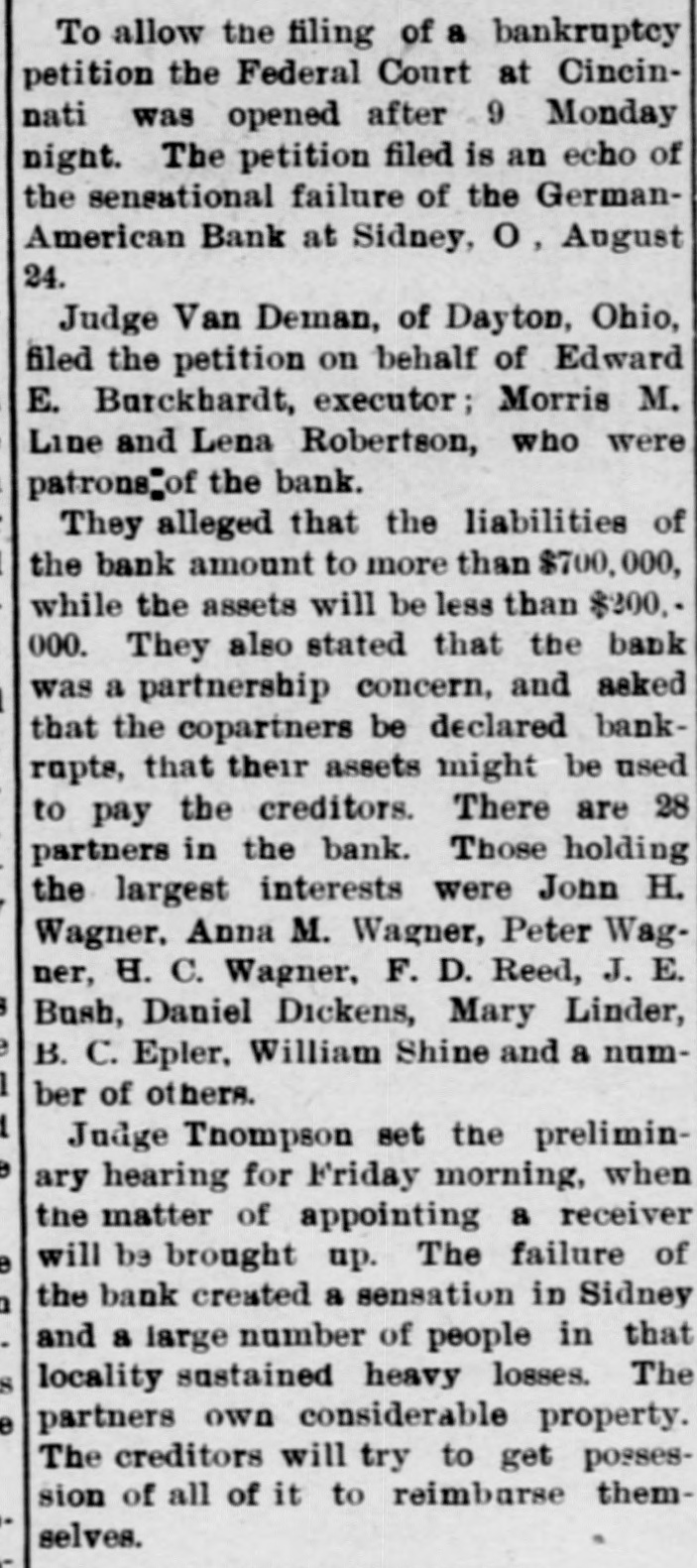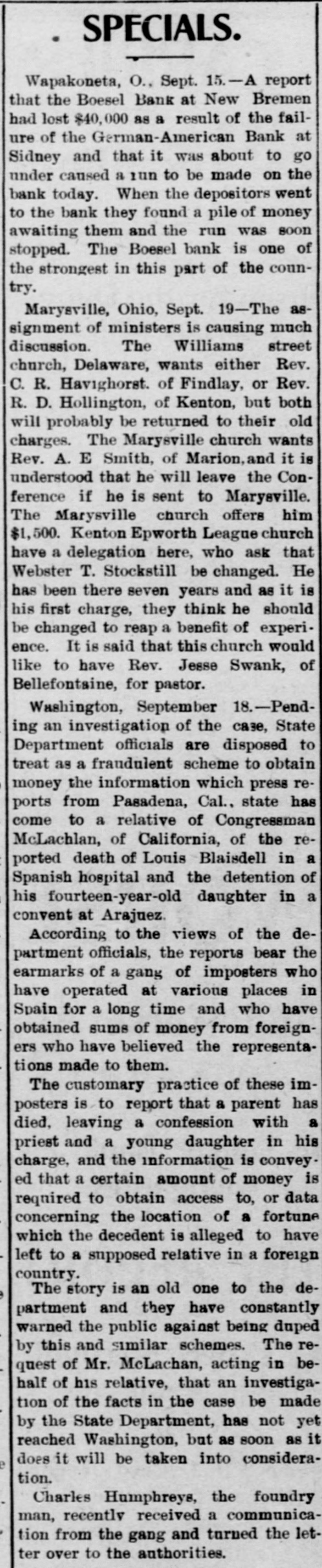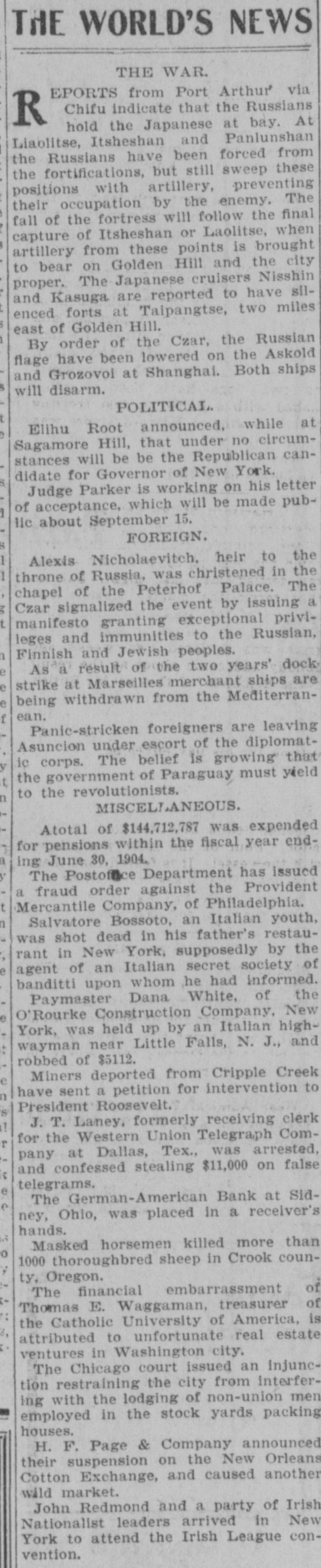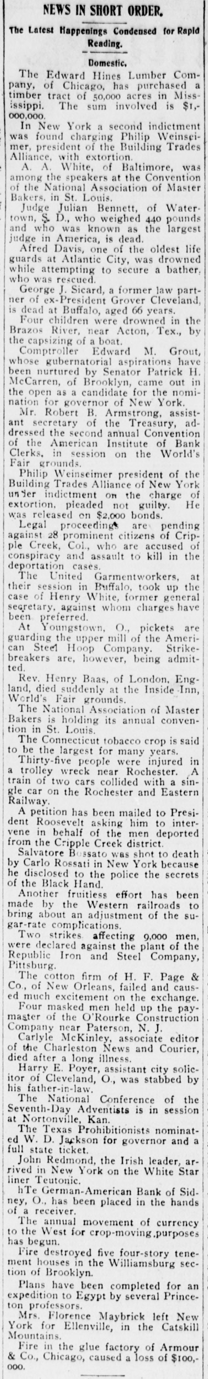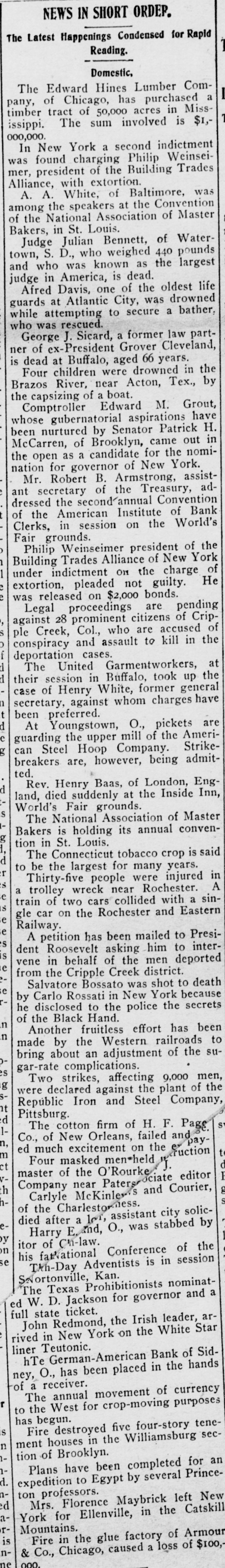 NEWS IN SHORT ORDEP. The Latest Happenings Condensed for Rapid Reading. Domestic, The Edward Hines Lumber Company, of Chicago, has purchased a timber tract of 50,000 acres in Mississippi. The sum involved is $1,000,000. In New York a second indictment was found charging Philip Weinseimer, president of the Building Trades Alliance, with extortion. A. A. White, of Baltimore, was among the speakers at the Convention of the National Association of Master Bakers, in St. Louis. Judge Julian Bennett, of Watertown, S. D., who weighed 440 pounds and who was known as the largest judge in America, is dead. Afred Davis, one of the oldest life guards at Atlantic City, was drowned while attempting to secure a bather, who was rescued. George J. Sicard, a former law partner of ex-President Grover Cleveland, is dead at Buffalo, aged 66 years. Four children were drowned in the Brazos River, near Acton, Tex., by the capsizing of a boat. Comptroller Edward M. Grout, whose gubernatorial aspirations have been nurtured by Senator Patrick H. McCarren, of Brooklyn, came out in the open as a candidate for the nomination for governor of New York. Mr. Robert B. Armstrong, assistant secretary of the Treasury, addressed the second'annual Convention of the American Institute of Bank Clerks, in session on the World's Fair grounds. Philip Weinseimer president of the Trades under indictment on the Building Alliance of New charge York He of extortion, pleaded not guilty. was released on $2,000 bonds. Legal proceedings are pending 28 who are against ple Creek, prominent Col., citizens accused kill of in Crip- the of conspiracy and assault to deportation cases. The United Garmentworkers, at their session in Buffalo, took up the case of Henry White, former general secretary, against whom charges have been preferred. d At Youngstown, O., pickets are e guarding the upper mill of the American Steel Hoop Company. Strikebreakers are, however, being admitted. Rev. Henry Baas, of London, Engd land, died suddenly at the Inside Inn, World's Fair grounds. Is The National Association of Master Bakers is holding its annual convention in St. Louis. The Connecticut tobacco crop is said d to be the largest for many years. Thirty-five people were injured in a trolley wreck near Rochester. A e train of two cars collided with a sinis gle car on the Rochester and Eastern e Railway. e A petition has been mailed to Presis dent Roosevelt asking him to interis vene in behalf of the men deported le from the Cripple Creek district. Salvatore Bossato was shot to death e by Carlo Rossati in New York because he disclosed to the police the secrets of the Black Hand. in Another fruitless effort has been in made by the Western railroads to bring about an adjustment of the sugar-rate complications. es Two strikes, affecting 9,000 men, g were declared against the plant of the Republic Iron and Steel Company, nt Pittsburg. d The cotton firm of H. F. Page 1Co., of New Orleans, failed and payn, ed much excitement on the fruction to m Four masked men*held d ct master of the O'Rourke editor I VCompany near Paters Lociate Courier, h Carlyle McKinle and hof died the after Charlestonness lot assistant city soliceHarry a and, O., was stabbed by by itor of Ch-law. n his fatNational Conference of the se Tkh-Day Adventists is in session SNortonville, Kan. The Texas Prohibitionists nominata ed W. D. Jackson for governor and full state ticket. John Redmond, the Irish leader, arrived in New York on the White Star liner Teutonic. hTe German-American Bank of Sidney, O., has been placed in the hands of a receiver. The annual movement of currency r to the West for crop-moving purposes has begun. Fire destroyed five four-story teneis ment houses in the Williamsburg secn tion of Brooklyn. Plans have been completed for an d. expedition to Egypt by several Princenton professors. Mrs. Florence Maybrick left New d aYork for Ellenville, in the Catskill ris Mountains. Fire in the glue factory of Armour n& Co., Chicago, caused a loss of $100, ne 000