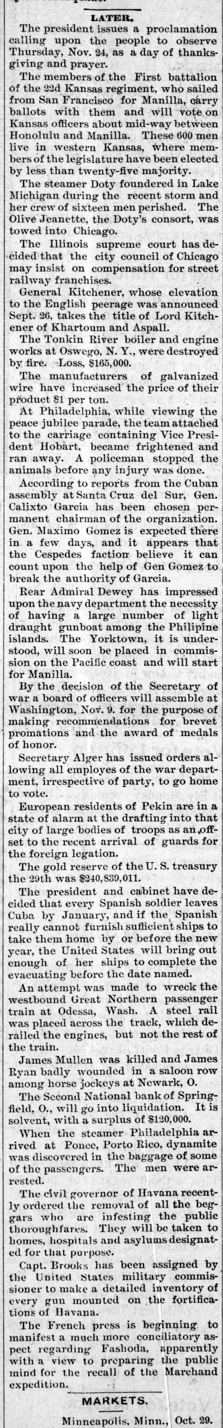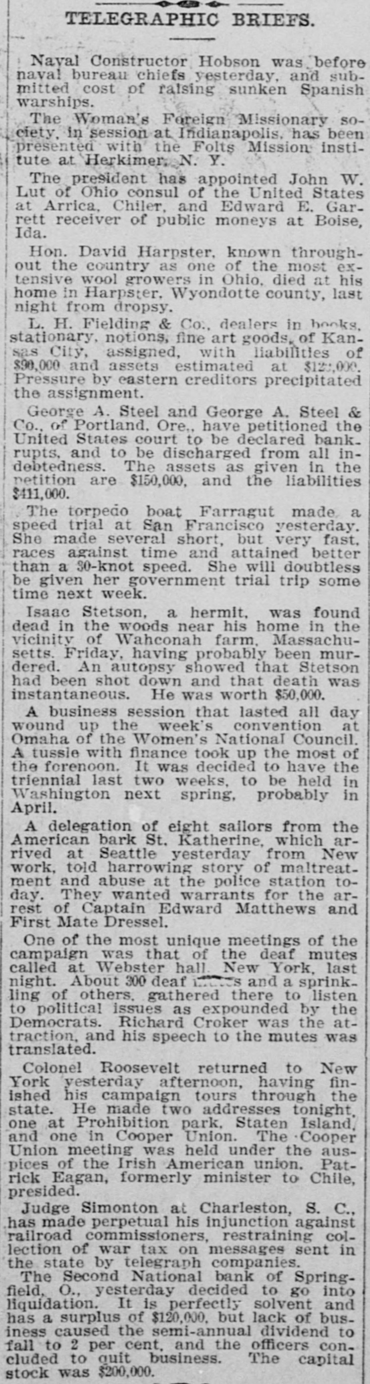 TELEGRAPHIC BRIEFS. Naval Constructor Hobson was before naval bureau chiefs yesterday, and submitted cost of raising sunken Spanish warships. The Woman's Foreign Missionary society, in session at Indianapolis, has been presented with the Folts Mission institute at Herkimer, N. Y. The president has appointed John W. Lut of Ohio consul of the United States at Arrica. Chiler, and Edward E. Garrett receiver of public moneys at Boise, Ida. Hon. David Harpster, known throughout the country as one of the most extensive wool growers in Ohio. died at his home in Harpster. Wyondotte county, last night from dropsy. L. H. Fielding & Co., dealers in books. stationary, notions, fine art goods, of Kansas City, assigned, with liabilities of $90,000 and assets estimated at $120,000. Pressure by eastern creditors precipitated the assignment. George A. Steel and George A. Steel & Co., of Portland, Ore., have petitioned the United States court to be declared bank. rupts, and to be discharged from all indebtedness. The assets as given in the petition are $150,000, and the liabilities $411,000. The torpedo boat Farragut made a speed trial at San Francisco yesterday. She made several short, but very fast. races against time and attained better than a 30-knot speed. She will doubtless be given her government trial trip some time next week. Isaac Stetson, a hermit. was found dead in the woods near his home in the vicinity of Wahconah farm, Massachusetts. Friday, having probably been murdered. An autopsy showed that Stetson had been shot down and that death was instantaneous. He was worth $50,000. A business session that lasted all day wound up the week's convention at Omaha of the Women's National Council. A tussie with finance took up the most of the forenoon. It was decided to have the triennial last two weeks, to be held in Washington next spring, probably in April. A delegation of eight sailors from the American bark St. Katherine, which arrived at Seattle yesterday from New work, told harrowing story of maltreat. ment and abuse at the police station today. They wanted warrants for the arrest of Captain Edward Matthews and First Mate Dressel. One of the most unique meetings of the campaign was that of the deaf mutes called at Webster hall. New York, last night. About 300 deaf I and a sprinkling of others. gathered there to listen to political issues as expounded by the Democrats. Richard Croker was the attraction, and his speech to the mutes was translated. Colonel Roosevelt returned to New York yesterday afternoon, having finished his campaign tours through the state. He made two addresses tonight. one at Prohibition park, Staten Island, and one in Cooper Union. The Cooper Union meeting was held under the auspices of the Irish American union. Patrick Eagan, formerly minister to Chile, presided. Judge Simonton at Charleston, S. C., has made perpetual his injunction against railroad commissioners, restraining collection of war tax on messages sent in the state by telegraph companies. The Second National bank of Springfield, O., yesterday decided to go into liquidation. It is perfectly solvent and has a surplus of $120,000. but lack of business caused the semi-annual dividend to fall to 2 per cent. and the officers concluded to quit business. The capital stock was $200,000.