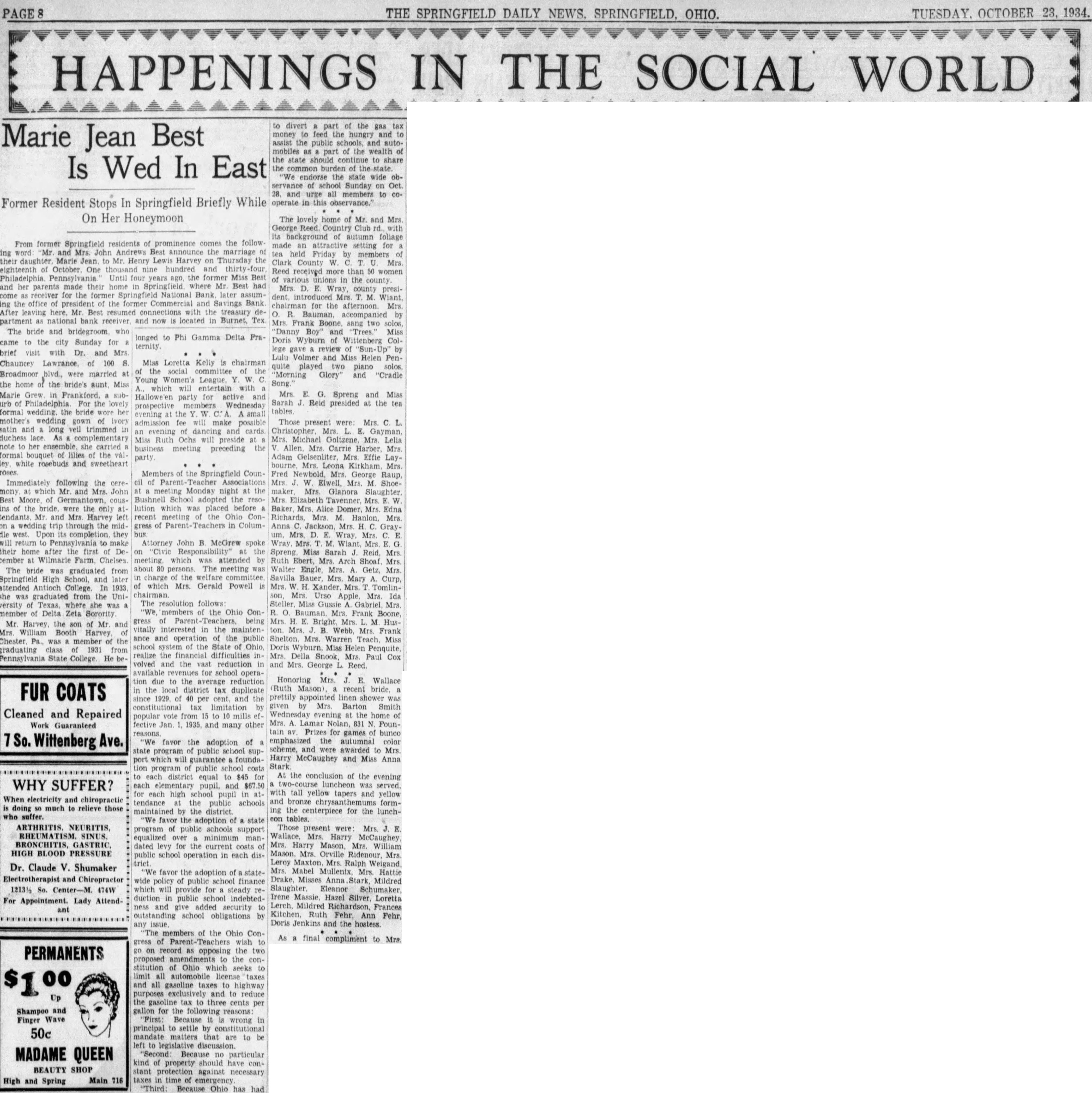 THE SPRINGFIELD DAILY NEWS. SPRINGFIELD, OHIO. TUESDAY. OCTOBER 23, 1934. HAPPENINGS IN THE SOCIAL WORLD