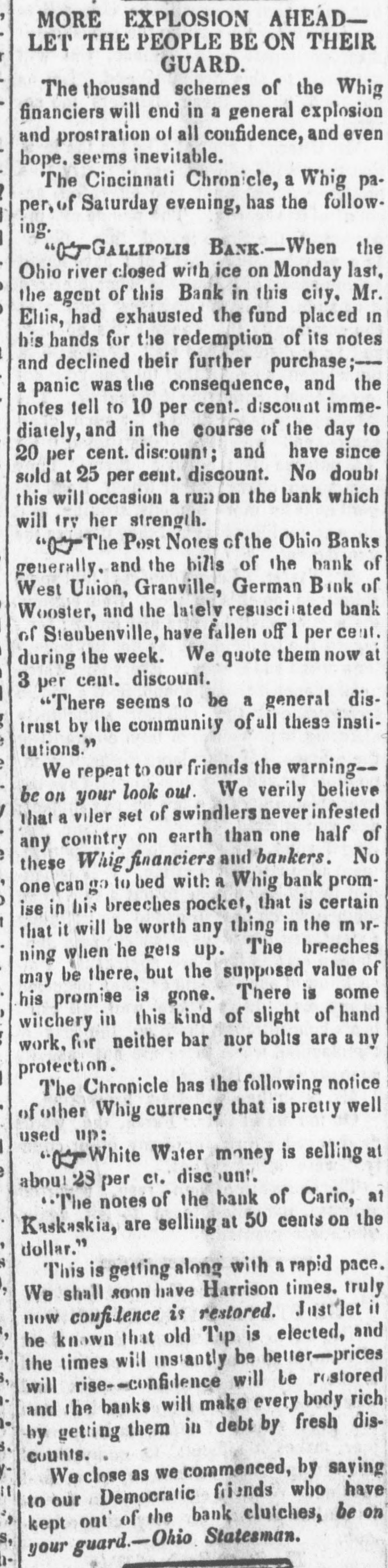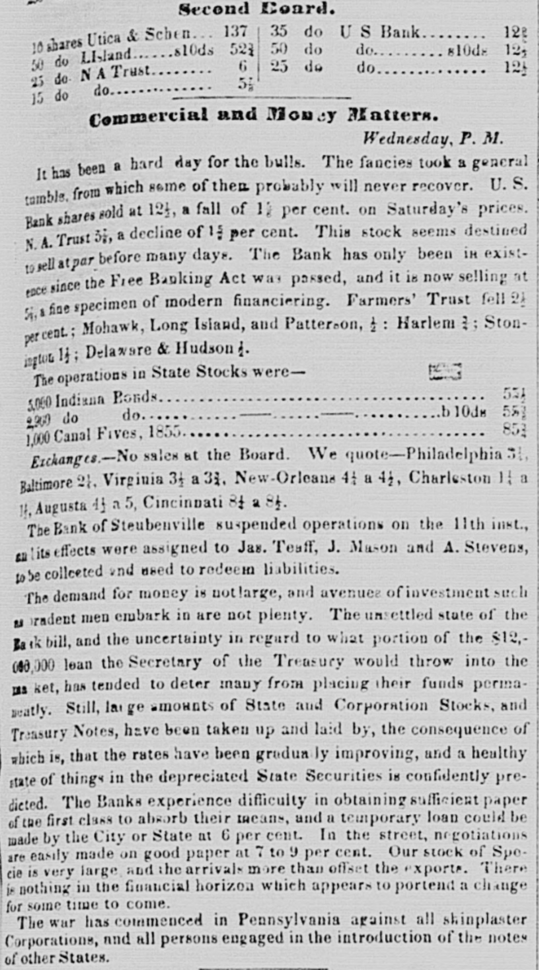 Second Board. 35 137 do 122 US Bank 50 10 shares Utica & Schen do de 521 slods 810ds 12, 50 do LIsland 6 de 25 do 12 25 do NA Trust 5g 15 do do Commercial and M ou ey Matters. Wednesday, P.M. It has been a hard day for the bulls. The fancies took a general tumble. from which some of then probably will never recover. U.S. Bank shares sold at 121, a fall of 1) per cent. on Saturday's prices. N. A. Trust 31, a decline of 15 per cent. This stock seems destined to sell at par before many days. The Bank has only been in existence since the Free Banking Act was passed, and it is now selling at 5, a fine specimen of modern financiering. Farmers' Trust fell 21 percent; Mohawk, Long Island, and Patterson, 1/2 : Harlem Stoninglud Delaware & Hudson 13 The operations in State Stocks were55) 5,000 Indiana Bonds 10dm 553 2900 do do 853 1,000 Canal Fives, 1855 Exchanges.-No sales at the Board. We quote-Philadelphia 31, Baltimore 21, Virginia 34 a 31. New-Orleans 41 a 41, Charleston a It, Augusta 11 a 5, Cincinnati 84 a 81. The Bank of Steubenville suspended operations on the 11th inst., unlits effects were assigned to Jas. Teaff, J. Mason and A. Stevens, to be collected and used to redeem liabilities. The demand for money is notlarge, and avenues of investment such radent men embark in are not plenty. The unsettled state of the Ba ik bill, and the uncertainty in regard to what portion of the $12,000,000 loan the Secretary of the Treasury would throw into the ISS ket, has tended to deter many from placing their funds permameatly. Still, la ge amounts of State and Corporation Stocks, and Treasury Notes, have been taken up and laid by, the consequence of which is, that the rates have been gradually improving, and a healthy state of things in the depreciated State Securities is confidently predicted. The Banks experience difficulty in obtaining sufficient paper of the first class to absorb their treams, and a temporary loan could be made by the City or State at 6 per cent. In the street, negotiations are easily made on good paper at 7 to 9 per cent. Our stock of Spocie is very large and the arrivals more than offset the exports. There is nothing in the financial horizon which appears to portend a change for some time to come. The war has commenced in Pennsylvania arainst all skinplaster Corporations, and all persons engaged in the introduction of the notes of other States.