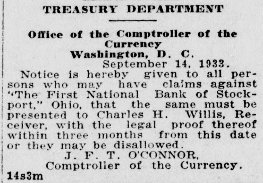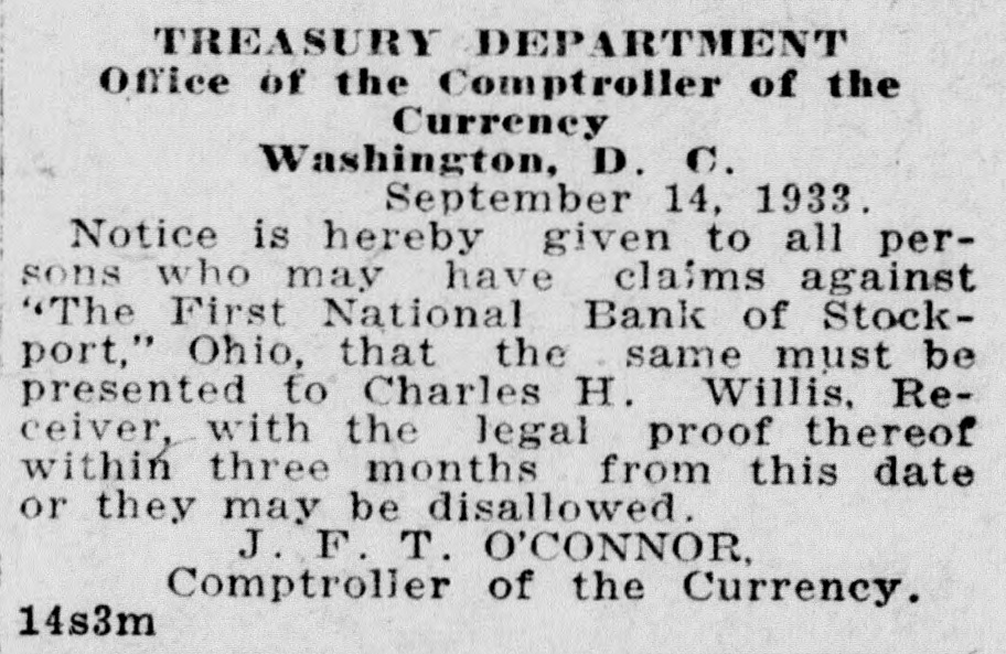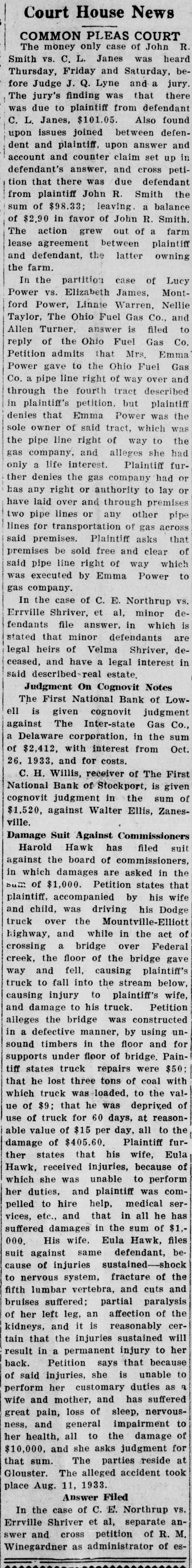 Court House News COMMON PLEAS COURT The money only case of John R. Smith VS. C. L. Janes was heard Thursday, Friday and Saturday, before Judge J. Q. Lyne and a jury. The jury's finding was that there was due to plaintiff from defendant C. L. Janes, $101.05. Also found upon issues joined between defendent and plaintiff, upon answer and account and counter claim set up in defendant's answer, and cross petition that there was due defendant from plaintiff John R. Smith the sum of $98.33; leaving. a balance of $2.90 in favor of John R. Smith. The action grew out of a farm lease agreement between plaintiff and defendant, the latter owning the farm. In the partition case of Lucy Power VS. Elizabeth James, Montford Power, Linnie Warren, Nellie Taylor, The Ohio Fuel Gas Co., and Allen Turner, answer is filed to reply of the Ohio Fuel Gas Co. Petition admits that Mrs. Emma Power gave to the Ohio Fuel Gas Co. a pipe line right of way over and through the fourth tract described in plaintiff's petition, but plaintiff denies that Emma Power was the sole owner of said tract, which was the pipe line right of way to the gas company, and alleges she had only a life interest. Plaintiff further denies the gas company had or has any right or authority to lay or have laid over and through premises two pipe lines or any other pipe lines for transportation of gas across said premises. Plaintiff asks that premises be sold free and clear of said pipe line right of way which was executed by Emma Power to gas company. In the case of C. E. Northrup vs. Errville Shriver, et al, minor defendants file answer, in which is stated that minor defendants are legal heirs of Velma Shriver, deceased, and have a legal interest in said described-real estate. Judgment On Cognovit Notes The First National Bank of Lowell is given cognovit judgment against The Inter-state Gas Co., a Delaware corporation, in the sum of $2,412, with interest from Oct. 26, 1933, and for costs. C. H. Willis, receiver of The First National Bank of Stockport, is given cognovit judgment in the sum of $1,520, against Walter Ellis, Zanesville. Damage Suit Against Commissioners Harold Hawk has filed suit against the board of commissioners, in which damages are asked in the sum of $1,000. Petition states that plaintiff. accompanied by his wife and child, was driving his Dodge truck over the Mountville-Elliott highway, and while in the act of crossing a bridge over Federal creek, the floor of the bridge gave way and fell, causing plaintiff's truck to fall into the stream below, causing injury to plaintiff's wife, and damage to his truck. Petition alleges the bridge was constructed in a defective manner, by using unsound timbers in the floor and for supports under floor of bridge. Paintiff states truck repairs were $50; that he lost three tons of coal with which truck was loaded, to the value of $9; that he was deprived of use of truck for 60 days, at reasonable value of $15 per day, all to the damage of $405.60. Plaintiff further states that his wife, Eula Hawk, received injuries, because of which she was unable to perform her duties, and plaintiff was compelled to hire help, medical services, etc., and that in all he has suffered damages in the sum of $1,000. His wife, Eula Hawk, files suit against same defendant, because of injuries sustained-shock to nervous system, fracture of the fifth lumbar vertebra, and cuts and bruises suffered; partial paralysis of her left leg, an affection of the kidneys, and it is reasonably certain that the injuries sustained will result in a permanent injury to her back. Petition says that because of said injuries, she is unable to perform her customary duties as a wife and mother, and has suffered great pain, loss of sleep, nervousness, and general impairment to her health, all to the damage of $10,000, and she asks judgment for that sum. The parties reside at Glouster. The alleged accident took place Aug. 11, 1933. Answer Filed In the case of C. E. Northrup vs.