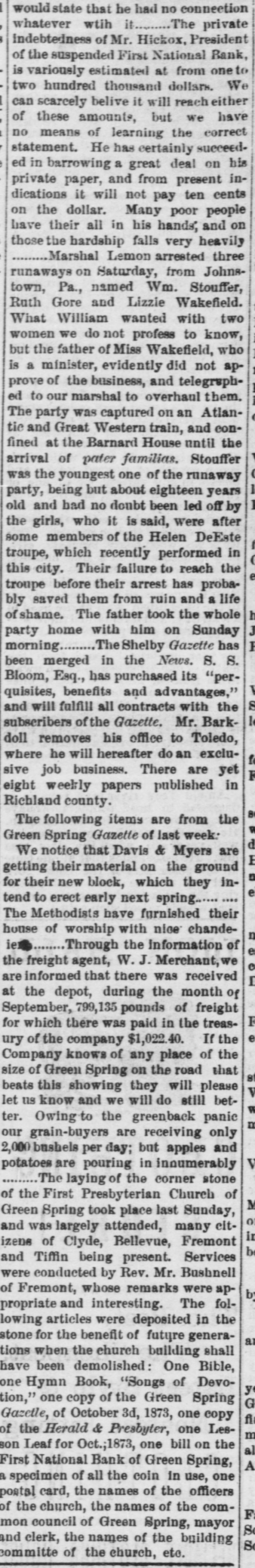 wtih it would state that he had no connection The private indebtedness whatever of Mr. Hickox, President Bank, the suspended First National one to of variously estimated at from We is hundred thousand dollars. either two scarcely belive it will reach have can these amounts, but we correct of of learning the statement. no means He has certainly succeed. his in barrowing a great deal on ined paper, and from present cents private it will not pay ten dications the dollar. Many poor and people on on their all in his hands, heavily those have the hardship falls very three Marshal Lemon arrested Johnson Saturday, from Stouffer, runaways Pa., named Wm. Wakefield. town, Gore and Lizzie two Ruth William wanted with What we do not profess to know, who women the father of Miss Wakefield, apbut minister, evidently did not is a of the business, and telegraph- them. prove our marshal to overhaul was captured on an Western train, The tie ed and to party Great until and Atlan- con- the at the Barnard House Stouffer fined of pater familias. one of the was but about eighteen off arrival party, the being youngest led runaway years by and bad no doubt been after old girls, who it is said, were DeEste the members of the Helen in some which recently performed reach the troupe, city. Their failure to probathis before their arrest has and a life troupe saved them from ruin whole bly of shame. The father took the Sunday party home with him on has The Shelby Gazette S. morning. merged in the News. S. "perbeen Esq., has purchased its Bloom, benefits and advantages," with the quisites, will fulfill all contracts Barkand subscribers of the Gazette. Mr. Toledo, his office to he will hereafter do an doll where removes exclu- yet job business. There are in eight sive weekly papers published Richland county. The following items are from week: the Spring Gazette of last Green We notice that Davis & Myers ground are their material on the ingetting for their new block, which they to erect early next spring. tend Methodists have furnished chande- their house The of worship with nice of Through the information ie freight agent, W.J. Merchant, received the informed that there was month of are the depot, during the freight at September, 799,135 pounds of treaswhich there was paid in the If the for of the company $1,022.40. of the knows of any place Green Spring on the size ury Company of will road please that this showing they still betbeats know and we will do let us to the greenback panic are our ter. grain-buyers Owing receiving apples only and bushels per day; but 2,000 potatoes are pouring in innumerably stone of the corner First Presbyterian took place last of Green the The Spring laying Church Sunday, cit- of largely attended, many Fremont and was of Clyde, Bellevue, Services izens Tiffin being present. Bushnell and conducted by Rev. Mr. apwere Fremont, whose remarks were folof and interesting. The articles were at for the benefit of future stone lowing propriate deposited building genera- in shall the when the church Bible, tions been demolished: One Devoy have Hymn Book, "Songs of Spring one one copy of the Green fl tion," of October 3d, 1873, one copy LesGazetle, Herald & Presbyter, one for Oct.; ;1873, one Bank of First of son the Leaf National Green in bill use, Spring, on one the specimen of all the coin officers a card, the names of the comF postal the church, the names of the S of council of Green Spring, building mayor S mon and clerk, the names of the etc. committe of the church,