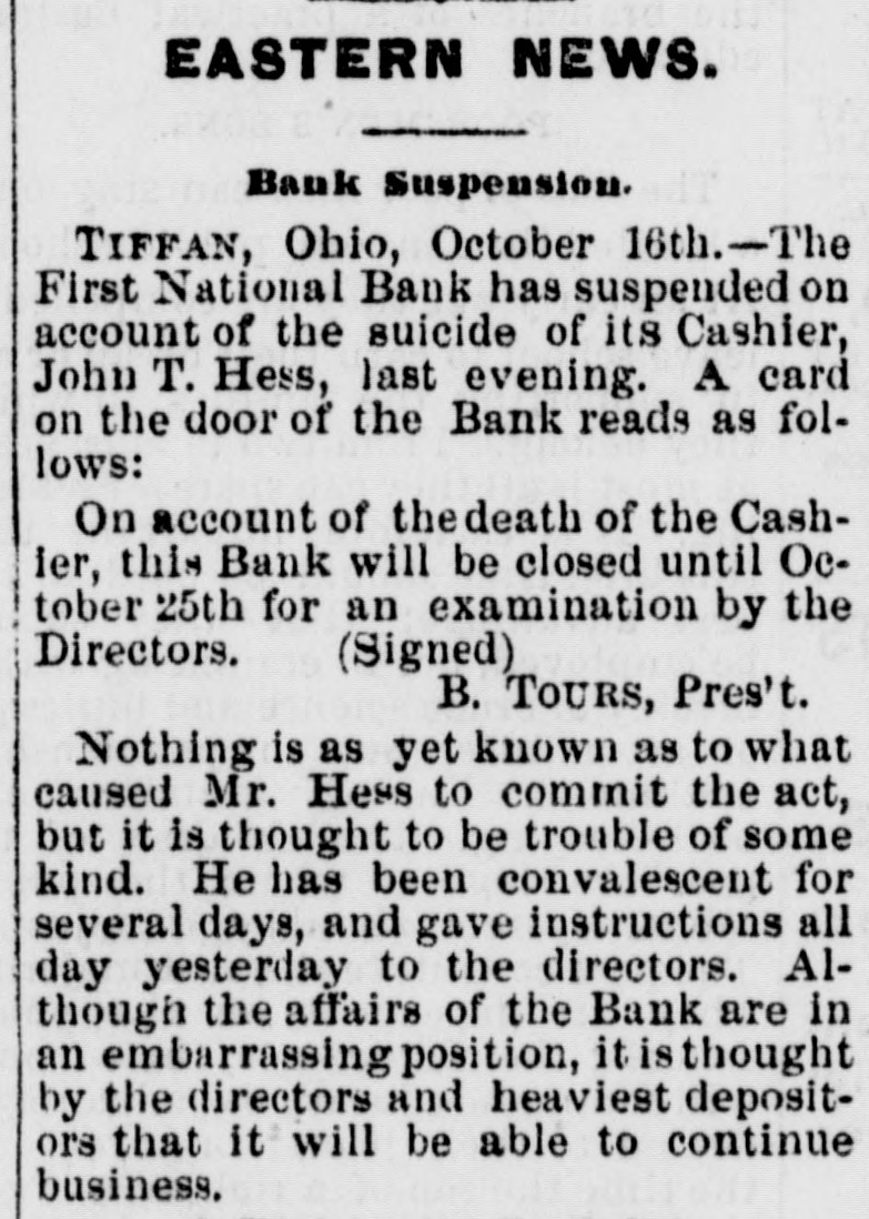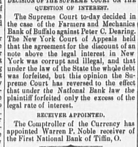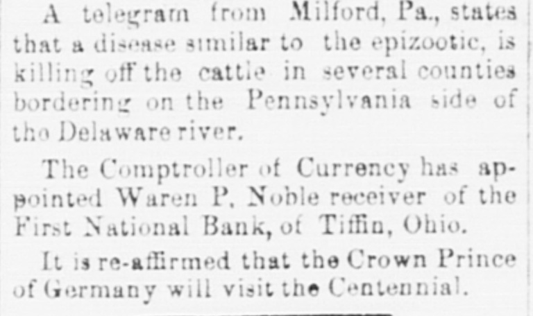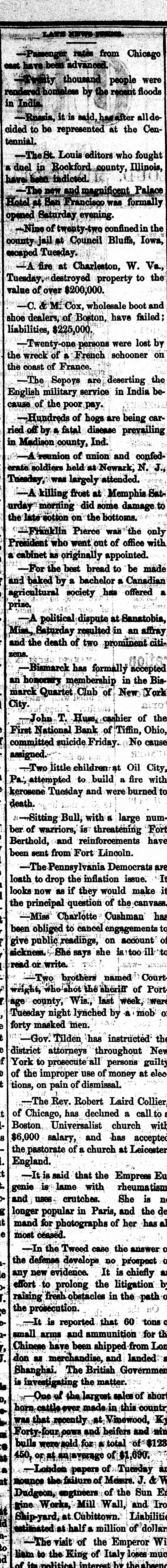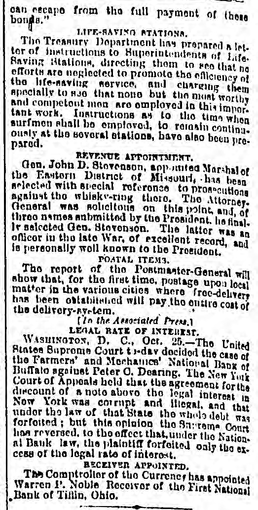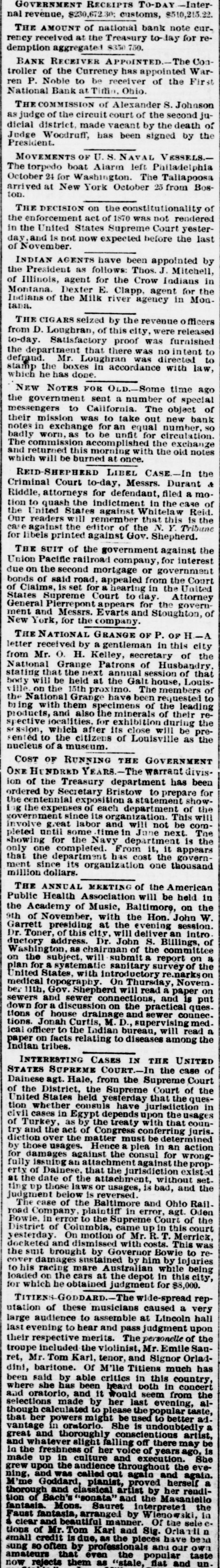 GOVERNMENT RECEIPTS TO-DAY -Internal revenue, $230,672.30; customs, $510,215.22. THE AMOUNT of national bank note currency received at the Treasury to-day for redemption aggregated $350 750. BANK RECEIVER APPOINTED.-The Controller of the Currency has appointed Warren P. Noble to be receiver of the First National Bank at Titfin, Ohio. THE COMMISSION of Alexander S. Johnson as judge of the circuit court of the second judicial district, made vacant by the death of Judge Woodruff, has been signed by the President. MOVEMENTS OF U.S. NAVAL VESSELS.The torpedo boat Alarm left Philadelphia October 24 for Washington. The Tallapoosa arrived at New York October 25 from Boston. THE DECISION on the constitutionality of the enforcement act of 1870 was not rendered in the United States Supreme Court yesterday and is not now expected before the last of November. INDIAN AGENTS have been appointed by the President as follows: Thos. J. Mitchell, of Illinois, agent for the Crow Indians in Montana. Dexter E. Clapp, agent for the Indians tana. of the Milk river agency in MonTHE CIGARS seized by the revenue officers from D. Loughran, of this city, were released to-day. Satisfactory proof was furnished the department that there was nointent to defraud. Mr. Loughran was directed to stamp the boxes in accordance with law, which he has done. NEW NOTES FOR OLD.Some time ago the government sent a number of special messengers to California. The object of their mission was to take out new bank notes in exchange for an equal number, SO badly worn, as to be unfit for circulation. The commission accomplished the exchange and returned this morning with the old notes which will be burned at once. REID-SHEPHERD LIBEL CASE-In the Criminal Court to-day, Messrs. Durant & Riddle, attorneys for defendant, filed a motion to quash the indictment in the case of the United States against Whitelaw Reid. Our readers will remember that this is the case against the editor of the N. Y. Tribune for libels printed against Gov. Shepherd. THE SUIT of the government against the Union Pacific railroad company, for interest due on the second mortgage or government bonds of said road, appealed from the Court of Claims. is set for a hearing in the United States Supreme Court to day. Attorney General Pierrepont appears for the government and Messrs. Evarts and Stoughton, of New York, for the company. THE NATIONAL GRANGE OF P. OF H-A letter received by a gentleman in this city from Mr. O. H. Kelley, secretary of the National Grange Patrons of Husbandry, stating that the next annual session of that body will be held at the Galt house, Louisville on the 15th proximo. The members of the National Grange have been requested to b1 ing with them specimens of the leading products, and also the minerals of their respective localities. for exhibition during the session, which after its close will be presented to the citizens of Louisville as the nucleus of a museum. COST OF RUNNING THE GOVERNMENT ONE HUNDRED YEARS.-The warrant division of the Treasury department has been ordered by Secretary Bristow to prepare for the centennial exposition a statement showing the expenses of each department of the government since its organization. This will Involve great labor and will not be completed until some time in June next. The showing for the Navy department is the only one completed. From it, it appears that the department has cost the government since its organization one thousand million dollars. THE ANNUAL MEETING of the American Public Health Association will be held in the Academy of Music, Baltimore, on the 9th of November, with the Hon. John W. Garrett presiding at the evening session. Dr. Toner, of this city, will deliver an intro. ductory address. Dr. John S. Billings, of Washington, as chairman of the committee on the subject, will submit a report on a plan for a systematic sanitary survey of the United States, with introductory renarkson medical topography. On Thursday, November 11th, Gov. Shepherd will read a paper on sewers and sewer connections, and is put down for a discussion on the practical questions of house drainage and sewer connec. tions. Jonah Curtis, M. D., supervising medical officer to the Indian bureau, will read a paper on facts relating to diseases among the Indian tribes. INTERESTING CASES IN THE UNITED STATES SUPREME COURT.-In the case of Dainese agt. Hale, from the Supreme Court of the District, the Supreme Court of the United States held yesterday that the question whether consuls have jurisdiction in civil cases in Egypt depends upon the usages of Turkey, as by the treaty with that country and the act of Congress conferring juris. diction over the matter must be determined by those usages. Hence a plea in an action for damages against the consul for wrongfully issuing an attachment against the property of Dainese, that the jurisdiction existed at the date of the attachment, without set. ting up those laws or usages, is bad, and the judgment below is reversed. The case of the Baltimore and Ohio Railroad Company, plaintiff in error, agt. Oden Bowie, in error to the Supreme Court of the District of Columbia, came up in this court yesterday. On motion of Mr. R. T. Merrick, docketed and dismissed with costs. This was the suit brought by Governor Bowie to recover damages sustained by him by injuries to his racing mare Australian while being loaded on the cars at the depot in this city, for which he obtained judgment for $8,000. TITIENS-GODDARD.-The wide-spread reputation of these musicians caused a very large audience to assemble at Lincoln hall last evening to hear and pass judgment upon their respective merits. The personelle of the troupe included the violinist, Mr. Emile Sauret, Mr. Tom Karl, tenor, and Signor Orladdini, baritone. Of M'lle Titiens much has been said by able critics in this country, where she has been heard both in concert and oratorio, and it would seem from the selections made by her last evening, although calculat