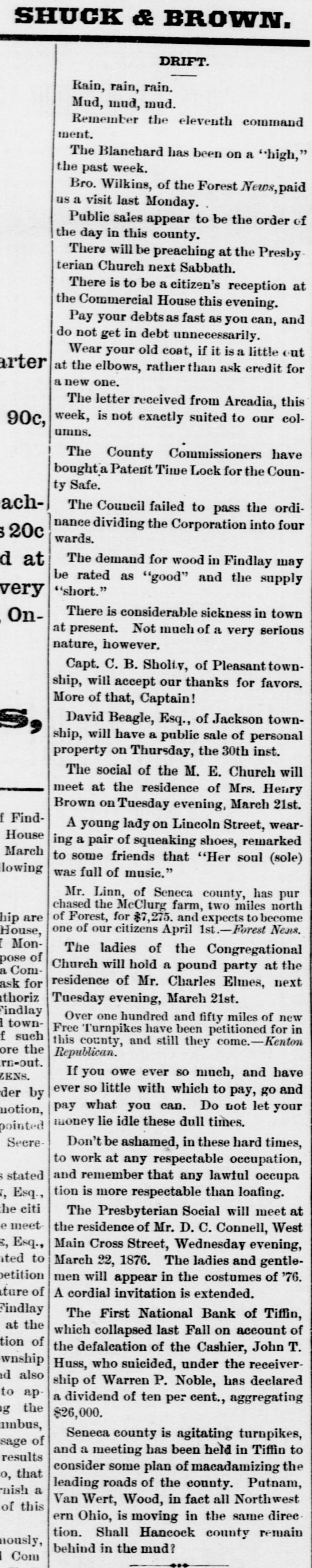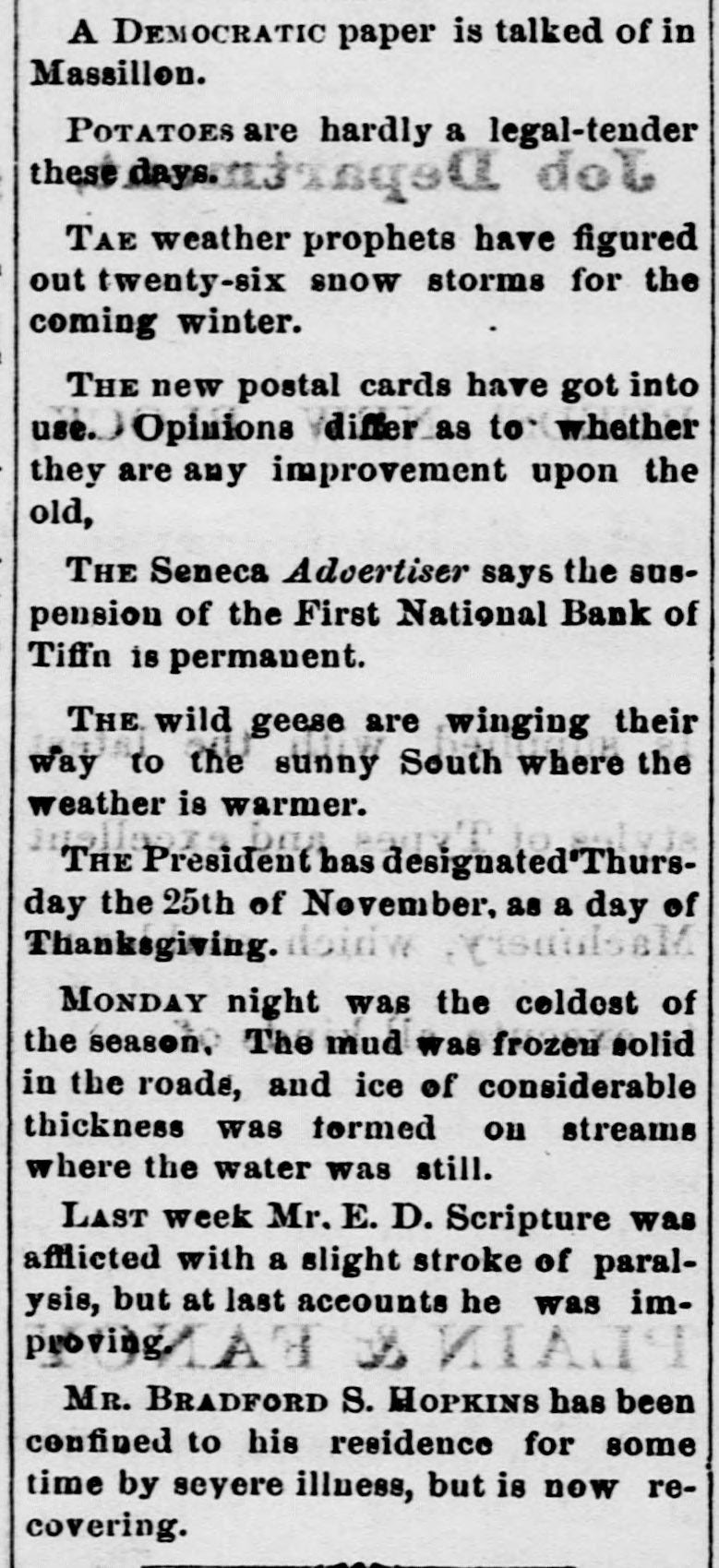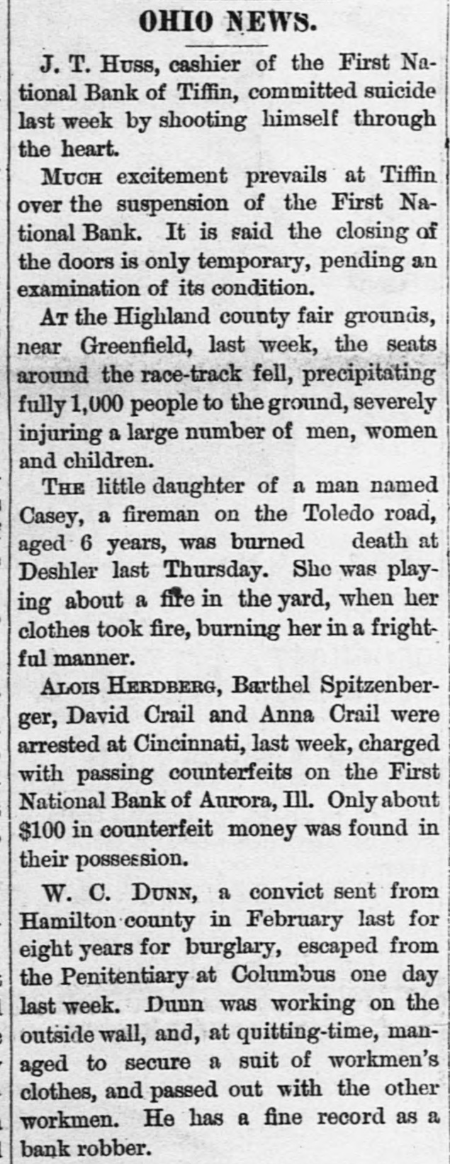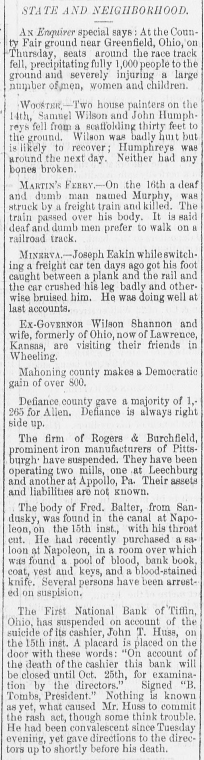 GOVERNMENT RECEIPTS TO-DAY -Internal revenue, $230,672.30; customs, $510,215.22. THE AMOUNT of national bank note currency received at the Treasury to-day for redemption aggregated $350 750. BANK RECEIVER APPOINTED.-The Controller of the Currency has appointed Warren P. Noble to be receiver of the First National Bank at Titfin, Ohio. THE COMMISSION of Alexander S. Johnson as judge of the circuit court of the second judicial district, made vacant by the death of Judge Woodruff, has been signed by the President. MOVEMENTS OF U.S. NAVAL VESSELS.The torpedo boat Alarm left Philadelphia October 24 for Washington. The Tallapoosa arrived at New York October 25 from Boston. THE DECISION on the constitutionality of the enforcement act of 1870 was not rendered in the United States Supreme Court yesterday and is not now expected before the last of November. INDIAN AGENTS have been appointed by the President as follows: Thos. J. Mitchell, of Illinois, agent for the Crow Indians in Montana. Dexter E. Clapp, agent for the Indians tana. of the Milk river agency in MonTHE CIGARS seized by the revenue officers from D. Loughran, of this city, were released to-day. Satisfactory proof was furnished the department that there was nointent to defraud. Mr. Loughran was directed to stamp the boxes in accordance with law, which he has done. NEW NOTES FOR OLD.Some time ago the government sent a number of special messengers to California. The object of their mission was to take out new bank notes in exchange for an equal number, SO badly worn, as to be unfit for circulation. The commission accomplished the exchange and returned this morning with the old notes which will be burned at once. REID-SHEPHERD LIBEL CASE-In the Criminal Court to-day, Messrs. Durant & Riddle, attorneys for defendant, filed a motion to quash the indictment in the case of the United States against Whitelaw Reid. Our readers will remember that this is the case against the editor of the N. Y. Tribune for libels printed against Gov. Shepherd. THE SUIT of the government against the Union Pacific railroad company, for interest due on the second mortgage or government bonds of said road, appealed from the Court of Claims. is set for a hearing in the United States Supreme Court to day. Attorney General Pierrepont appears for the government and Messrs. Evarts and Stoughton, of New York, for the company. THE NATIONAL GRANGE OF P. OF H-A letter received by a gentleman in this city from Mr. O. H. Kelley, secretary of the National Grange Patrons of Husbandry, stating that the next annual session of that body will be held at the Galt house, Louisville on the 15th proximo. The members of the National Grange have been requested to b1 ing with them specimens of the leading products, and also the minerals of their respective localities. for exhibition during the session, which after its close will be presented to the citizens of Louisville as the nucleus of a museum. COST OF RUNNING THE GOVERNMENT ONE HUNDRED YEARS.-The warrant division of the Treasury department has been ordered by Secretary Bristow to prepare for the centennial exposition a statement showing the expenses of each department of the government since its organization. This will Involve great labor and will not be completed until some time in June next. The showing for the Navy department is the only one completed. From it, it appears that the department has cost the government since its organization one thousand million dollars. THE ANNUAL MEETING of the American Public Health Association will be held in the Academy of Music, Baltimore, on the 9th of November, with the Hon. John W. Garrett presiding at the evening session. Dr. Toner, of this city, will deliver an intro. ductory address. Dr. John S. Billings, of Washington, as chairman of the committee on the subject, will submit a report on a plan for a systematic sanitary survey of the United States, with introductory renarkson medical topography. On Thursday, November 11th, Gov. Shepherd will read a paper on sewers and sewer connections, and is put down for a discussion on the practical questions of house drainage and sewer connec. tions. Jonah Curtis, M. D., supervising medical officer to the Indian bureau, will read a paper on facts relating to diseases among the Indian tribes. INTERESTING CASES IN THE UNITED STATES SUPREME COURT.-In the case of Dainese agt. Hale, from the Supreme Court of the District, the Supreme Court of the United States held yesterday that the question whether consuls have jurisdiction in civil cases in Egypt depends upon the usages of Turkey, as by the treaty with that country and the act of Congress conferring juris. diction over the matter must be determined by those usages. Hence a plea in an action for damages against the consul for wrongfully issuing an attachment against the property of Dainese, that the jurisdiction existed at the date of the attachment, without set. ting up those laws or usages, is bad, and the judgment below is reversed. The case of the Baltimore and Ohio Railroad Company, plaintiff in error, agt. Oden Bowie, in error to the Supreme Court of the District of Columbia, came up in this court yesterday. On motion of Mr. R. T. Merrick, docketed and dismissed with costs. This was the suit brought by Governor Bowie to recover damages sustained by him by injuries to his racing mare Australian while being loaded on the cars at the depot in this city, for which he obtained judgment for $8,000. TITIENS-GODDARD.-The wide-spread reputation of these musicians caused a very large audience to assemble at Lincoln hall last evening to hear and pass judgment upon their respective merits. The personelle of the troupe included the violinist, Mr. Emile Sauret, Mr. Tom Karl, tenor, and Signor Orladdini, baritone. Of M'lle Titiens much has been said by able critics in this country, where she has been heard both in concert and oratorio, and it would seem from the selections made by her last evening, although calculat