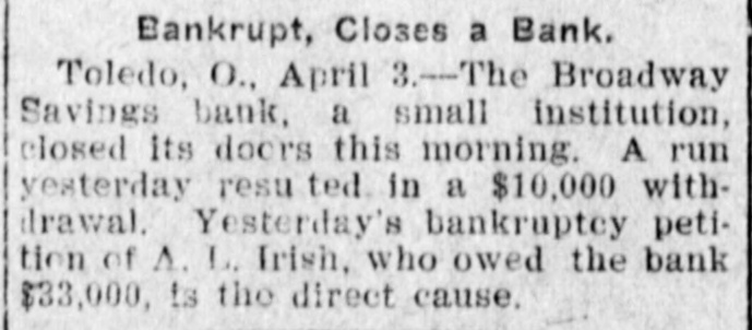 Bankrupt, Closes a Bank. Toledo, O., April 3.-The Broadway Savings bank, a small institution, closed its doors this morning. A run yesterday resu ted. in a $10,000 withdrawal. Yesterday's bankruptcy petition of 1. L. Irish, who owed the bank $33,000, is the direct cause.