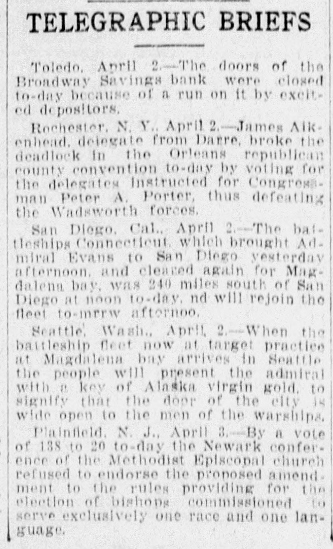 TELEGRAPHIC BRIEFS Toledo, April -The doors of the Broadway Savings bank were closed to-day because of a run on it by excited depositors. Rochester, N. Y., April 2. -James Alk enhead, delegate from Darre, broke the deadlock in the Orleans republican county convention to-day by voting for the delegates Instructed for Congressman Peter A. Porter, thus defeating the Wadsworth forces. San Diego, Cal. April --The baiHeships Connecticut which brought Ad. miral Evans to San Diego yesterday afternoon. and cleared again for Magdalena bay, was 240 miles south of San Diego at noon to-day. nd will rejoin the fleet to-mrrw afternoo. Seattle Wash. April 2. When the battleship fleet now at target practice at Magdalena bay arrives in Seattle the people will present the admiral with II key of Alaska virgin gold. to signify that the door of the city 14 wide open to the men of the warships. Plainfield N. J., April 3.-By a vote of 188 to 20 to-day the Newark conference of the Methodist Episcopal church refused to endorse the proposed amendment to the rules providing for the election of bishops commissioned to serve exclusively one race and one language.