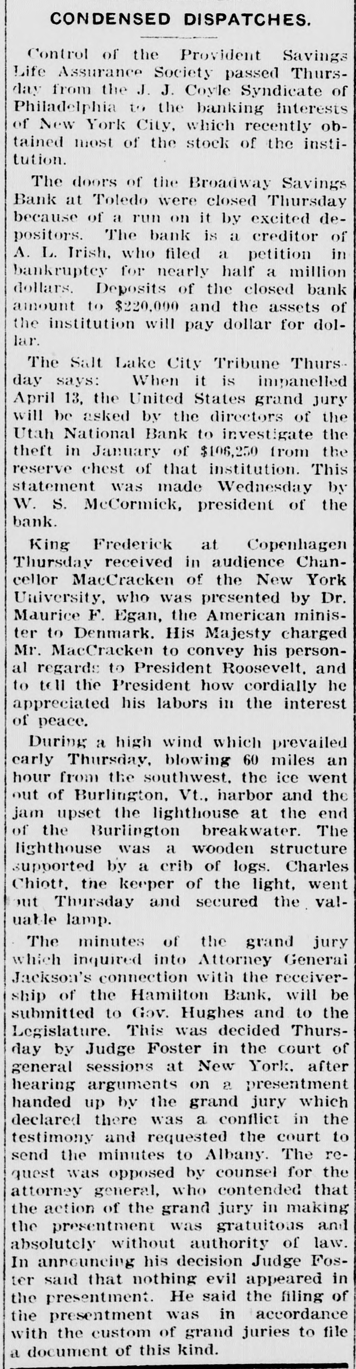 CONDENSED DISPATCHES. Control of the Provident Savings Life Assurance Society passed Thursday from the J. J. Coyle Syndicate of Philadelphia to the banking interests of New York City, which recently obtained most of the stock of the institution. The doors of the Broadway Savings Bank at Toledo were closed Thursday because of a run on it by excited depositors. The bank is a creditor of A. L. Irish, who filed a petition in bankruptcy for nearly half a million dollars. Deposits of the closed bank amount to $220.000 and the assets of the institution will pay dollar for dollar. The Salt Lake City Tribune Thursday says: When it is impanelled April 13, the United States grand jury will be asked by the directors of the Utah National Bank to investigate the theft in January of $106,250 from the reserve chest of that institution. This statement was made Wednesday by W. S. McCormick, president of the bank. King Frederick at Copenhagen Thursday received in audience Chancellor MacCracken of the New York University, who was presented by Dr. Maurice F. Egan, the American minister to Denmark. His Majesty charged Mr. MacCracken to convey his personal regards to President Roosevelt, and to tell the President how cordially he appreciated his labors in the interest of peace. During a high wind which prevailed early Thursday, blowing 60 miles an hour from the southwest. the ice went out of Burlington, Vt., harbor and the jam upset the lighthouse at the end of the Burlington breakwater. The lighthouse was a wooden structure supported by a crib of logs. Charles Chiott. the keeper of the light, went out Thursday and secured the valuable lamp. The minutes of the grand jury which inquired into Attorney General Jackson's connection with the receivership of the Hamilton Bank, will be submitted to Gov. Hughes and to the Legislature. This was decided Thursday by Judge Foster in the court of general sessions at New York. after hearing arguments on a presentment handed up by the grand jury which declared there was a conflict in the testimony and requested the court to send the minutes to Albany. The request was opposed by counsel for the attorney general, who contended that the action of the grand jury in making the presentment was gratuitous and absolutely without authority of law. In announcing his decision Judge Foster said that nothing evil appeared in the presentment. He said the filing of the presentment was in accordance with the custom of grand juries to file a document of this kind.