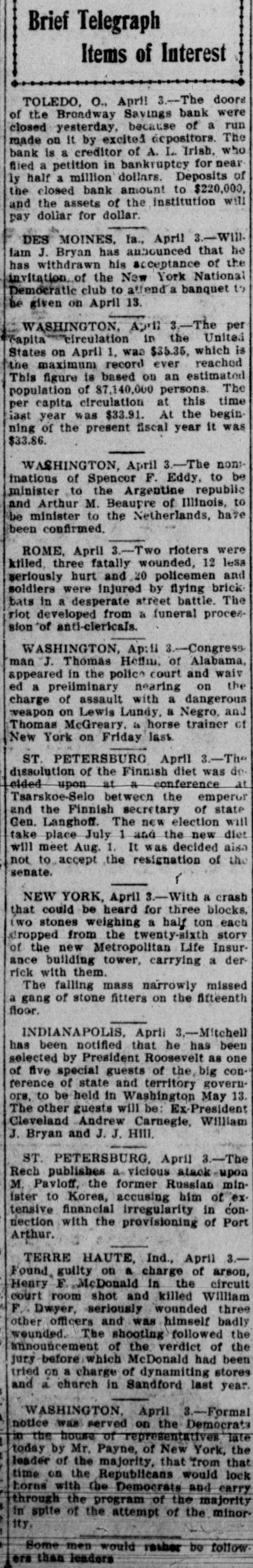 Brief Telegraph Items of Interest TOLEDO, O., April 3.-The doors of the Broadway Savings bank were closed yesterday, because of a run made on it by excited depositors. The bank is a creditor of A. L. Trish, who filed a petition in bankruptcy for near ly half a million dollars. Deposits of the closed bank amount to $220,000, and the assets of the institution will pay dollar for dollar. DES MOINES, la., April 3.-Will. fam J. Bryan has announced that he has withdrawn his acceptance of the invitation of the New York National Democratic club to attenda banquet to be given on April 13. WASHINGTON, April 3.-The per capita circulation in the United States on April 1, was $35.35, which is the maximum record ever reached This figure is based on an estimated population of 87,140,000 persons. The per capita circulation at this time last year was $33.91. At the beginning of the present fiscal year it was $33.86. WASHINGTON, April 3.-The noninations of Spencer F. Eddy, to be minister to the Argentine republic and Arthur M. Beaurre of Illinois, to be minister to the Netherlands, have been confirmed. ROME, April 3.-Two rioters were killed, three fatally wounded, 12 less seriously hurt and 20 policemen and soldiers were injured by flying brick bats in a desperate street battle. The riot developed from a funeral procession of anti-clericals. WASHINGTON, Ap:11 3.-Congress man J. Thomas Heffin. of Alabama, appeared in the police court and waiv ed a preliminary hearing on the charge of assault with a dangerous weapon on Lewis Lundy, a Negro, and Thomas McGreary. is horse trainer of New York on Friday last. ST. PETERSBURG April 3.-The dissolution of the Finnish diet was de cided upon at # conference at Tsarskoe-Selo between the emperor and the Finnish secretary of state Gen. Langhoff. The new election will take place July 1 and the new diet will meet Aug. 1. It was decided aisa not to accept the resignation of the senate. r NEW YORK, April 3.-With a crash that could be heard for three blocks, two stones weighing a half ton each dropped from the twenty-sixth story of the new Metropolitan Life Insurance building tower, carrying a derrick with them. The falling mass narrowly missed a gang of stone fitters on the fifteenth floor. INDIANAPOLIS, April 3.-Mitchell has been notified that he has been selected by President Roosevelt as one of five special guests of the, big conrerence of state and territory governors, to be held in Washington May 13. The other guests will be: Ex-President Cleveland Andrew Carnegie, William J. Bryan and J. J. Hill, ST. PETERSBURG, April 3.-The Rech publishes a. vicious atack upon M. Pavloff, the former Russian minlater to Korea, accusing him of extensive financial irregularity in connection with the provisioning of Port Arthur. TERRE HAUTE, Ind., April 3.Found guilty on a charge of arson, Henry F. McDonald in the circuit court room shot and killed William F Dwyer, seriously wounded three other officers and was himself badly wounded. The shooting followed the announcement of the verdict of the jury before which McDonald had been tried on a charge of dynamiting stores and a church in Sandford last year. WASHINGTON, April 3.-Formal notice was served on the Democrats in the house of representatives late today by Mr. Payne, of New York, the