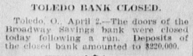 Toledo Bank Closes. Toledo, Ohio, April 2-The doors of the Broadway Savings Bank were closed today because of a run made on it by excited depositors. The bank is a creditor of A. L. Irish. who filed a petition in bankruptcy for nearly half a million dollars. Deposits of . the closed bank amount to $220,000 and the assets of the institution will pay dollar for dollar.