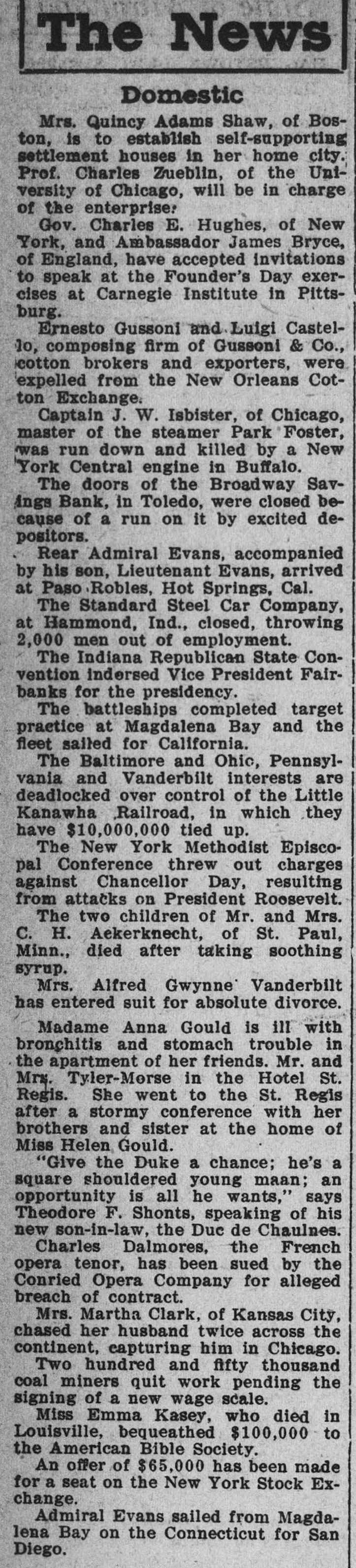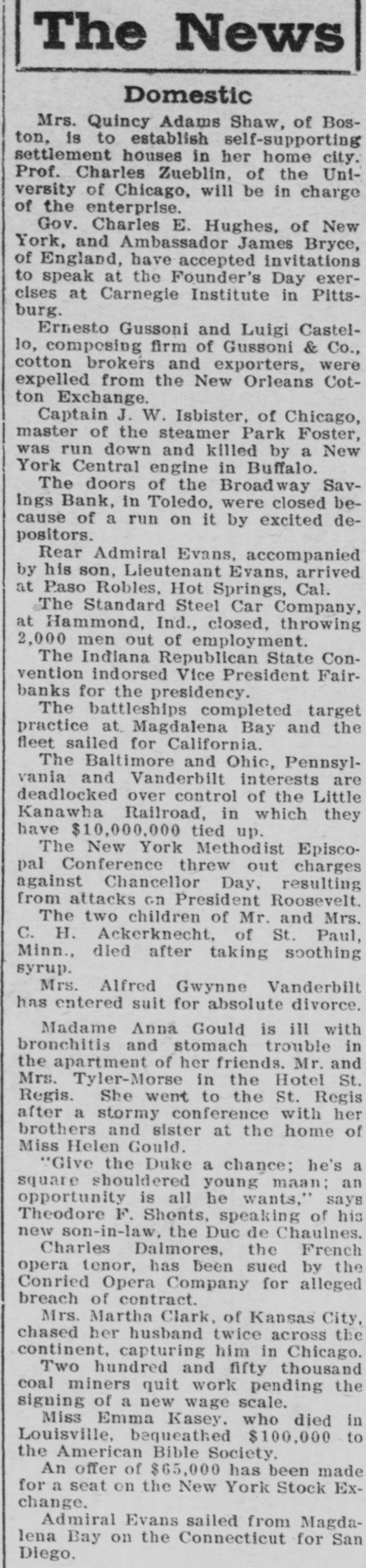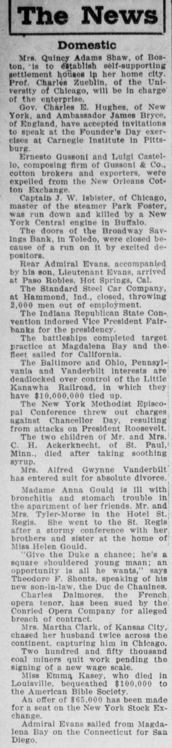The News Domestic Mrs. Quincy Adams Shaw, of Boston, is to establish self-supporting settlement houses in her home city. Prof. Charles Zueblin, of the University of Chicago, will be in charge of the enterprise. Gov. Charles E. Hughes, of New York, and Ambassador James Bryce, of England, have accepted invitations to speak at the Founder's Day exercises at Carnegie Institute in Pittsburg. Ernesto Gussoni and Luigi Castel10, composing firm of Gussoni & Co., cotton brokers and exporters, were expelled from the New Orleans Cotton Exchange. Captain J. W. Isbister, of Chicago, master of the steamer Park Foster, was run down and killed by a New York Central engine in Buffalo. The doors of the Broadway SavIngs Bank, in Toledo, were closed because of a run on it by excited depositors. Rear Admiral Evans, accompanied by his son, Lieutenant Evans, arrived at Paso Robles, Hot Springs, Cal. The Standard Steel Car Company, at Hammond, Ind., closed, throwing 2,000 men out of employment. The Indiana Republican State Convention indorsed Vice President Fairbanks for the presidency. The battleships completed target practice at Magdalena Bay and the fleet sailed for California. The Baltimore and Ohio, Pennsylvania and Vanderbilt interests are deadlocked over control of the Little Kanawha Railroad, in which they have $10,000,000 tied up. The New York Methodist Episcopal Conference threw out charges against Chancellor Day, resulting from attacks on President Roosevelt. The two children of Mr. and Mrs. C. H. Ackerknecht, of St. Paul, Minn., died after taking soothing syrup. Mrs. Alfred Gwynne Vanderbilt has entered suit for absolute divorce. Madame Anna Gould is ill with bronchitis and stomach trouble in the apartment of her friends. Mr. and Mrs. Tyler-Morse in the Hotel St. Regis. She went to the St. Regis after a stormy conference with her brothers and sister at the home of Miss Helen Gould. "Give the Duke a chance; he's a square shouldered young maan; an opportunity is all he wants," says Theodore F. Shonts, speaking of his new son-in-law, the Duc de Chaulnes. Charles Dalmores, the French opera tenor, has been sued by the Conried Opera Company for alleged breach of contract. Mrs. Martha Clark, of Kansas City, chased her husband twice across the continent, capturing him in Chicago. Two hundred and fifty thousand coal miners quit work pending the signing of a new wage scale. Miss Emma Kasey, who died in Louisville, bequeathed $100,000 to the American Bible Society. An offer of $65,000 has been made for a seat on the New York Stock Exchange. Admiral Evans sailed from Magdalena Bay on the Connecticut for San Diego.