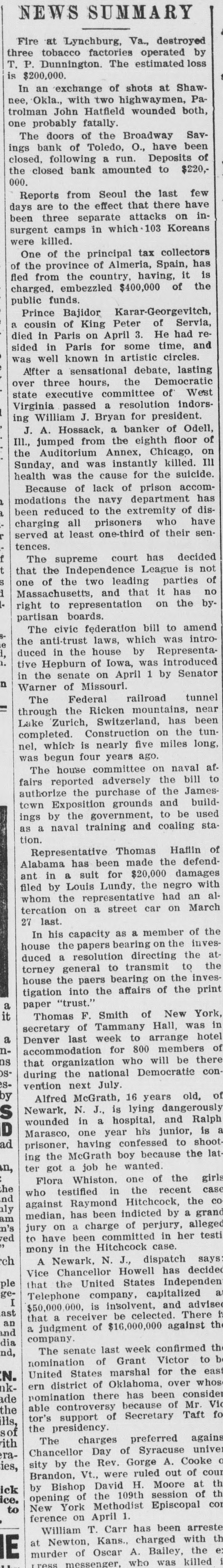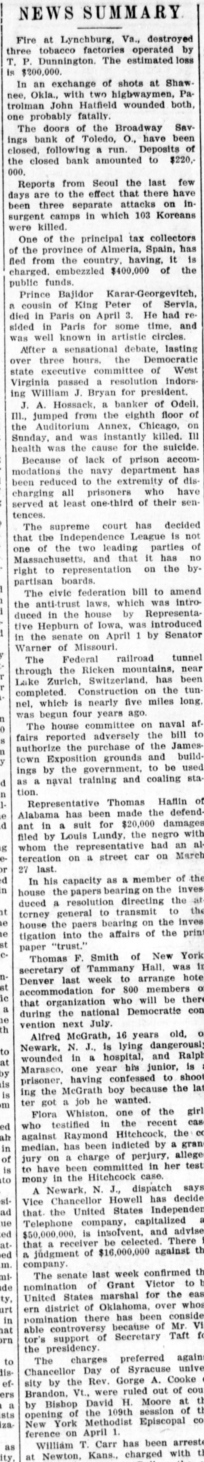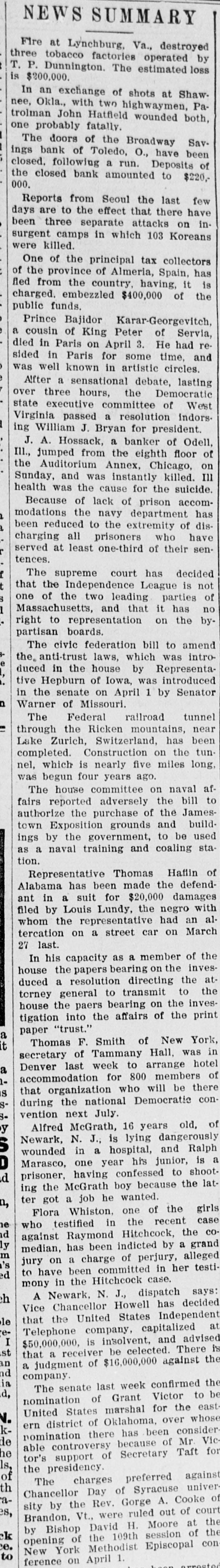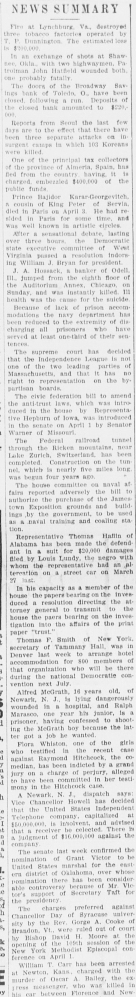 NEWS SUMMARY Fire at Lynchburg, Va., destroyed three T. tobacco factories operated P Dunnington. The estimated loss by is $200,000. In an exchange of shots at Shaw. nee, Okla., with two highwaymen, Pa trolman John Hatfield wounded both. one probably fatally The doors of the Broadway Savings bank of Toledo. O., have been closed. the following a run. Deposits of 000, closed bank amounted to $220,Reports from Seoul the last few days are to the effect that there have been three separate attacks on in surgent camps in which 103 Koreans were killed. One of the principal tax collectors of fled the province of Almeria. Spain, has from the country having, It is charged. embezzled $400,000 of the public funds Prince Bajidor Karar-Georgevitch. a cousin of King Peter of Servia, died in Paris on April 3. He had sided in Paris for some time. and rewas well known in artistic circles. Alfter a sensational debate. lasting over three hours, the Democratic state executive committee of West ing Virginia passed a resolution indors. William J. Bryan for president. J. A. Hossack, a banker of Odell, III., jumped from the eighth floor of the Auditorium Annex, Chicago, Sunday, and was instantly killed. on Ill health was the cause for the suicide. Because of lack of prison accommodations been the navy department has reduced to the extremity of dis. charging all prisoners who have served tences. at least one-third of their senThe supreme court has decided that the Independence League is not one of the two leading parties of Massachusetts. and that it has no right to representation on the bypartisan boards. The civic federation bill to amend the anti-trust laws, which was introduced in the house by Representative in Hepburn of Iowa, was introduced the senate on April 1 by Senator Warner of Missouri. The Federal railroad tunnel through the Ricken mountains, near Lake Zurich. Switzerland. has been completed. Construction on the tun nel, which is nearly five miles long, was begun four years ago. The house committee on naval at fairs reported adversely the bill to authorize the purchase of the Jamestown Exposition grounds and buildings by the government, to be used as tion. a naval training and coaling sta Representative Thomas Haflin of Alabama has been made the defend. ant in a suit for $20,000 damages filed by Louis Lundy, the negro with whom the representative had an altercatión on a street car on March 27 last. In his capacity as a member of the house the papers bearing on the inves. duced a resolution directing the attorney general to transmit to the house the paers bearing on the investigation into the affairs of the print paper "trust." Thomas F. Smith of New York, secretary of Tammany Hall, was in Denver last week to arrange hotel accommodation for 800 members of that organization who will be there during the national Democratic convention next July. Alfred McGrath, 16 years old, of Newark, N. J., is lying dangerously wounded in a hospital, and Ralph Marasco. one year his junior, is a I prisoner. having confessed to shooting the McGrath boy because the lat. ter got a job he wanted. Flora Whiston, one of the girls who testified in the recent case against Raymond Hitchcock, the COmedian, has been indicted by a grand jury on a charge of perjury, alleged to have been committed in her testimony in the Hitchcock case. A Newark. N. J., dispatch says: Vice Chancellor Howell has decided that the United States Independent Telephone company, capitalized $50,000,000. is insolvent, and advised at that a receiver be celected. There is company a judgment of $16,000,000 against the The senate last week confirmed the nomination of Grant Victor to be United States marshal for the east ern district of Oklahoma, over whose nomination there has been consider able controversy because of Mr Vie tor's support of Secretary Taft for the presidency. } The charges preferred against Chancellor Day of Syracuse university by the Rev. Gorge A. Cooke of Brandon, Vt., were ruled out of court by Bishop David H. Moore at the opening of the 109th session of the New York Methodist Episcopal con ference on April 1. William T. Carr has been arrested at Newton, Kans., charged with the murder of Oscar A Balley, the ex his press messenger, who was killed in car between Florence and New
