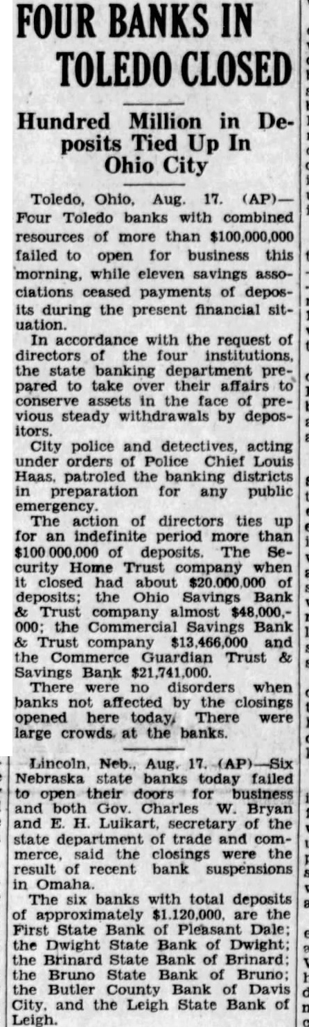 Silver Bar silver continued un changed at the close of the week holding at 27% an ounce New York and 12% pence in London Washington, August 15the Farm Board finally will adopt to the Southern cot farmer his low dilemma tonight the close interest of toel-Operations of steel mills in Washington the Youngstown district next week Hope been virtually abandoned will average per cent of rated for its proposal that third of the an increase of one per cent current crop be destroyed and over the past week, Dow, Jones & ization supplies held off the market Co. estimates. for year At least five actual rejections been received the Governors TOLEDO BANKS CLOSED. who were asked to join in the program. Three Savings Institutions Turned There apparently is no immediate Over To State Department. prospect of action although many to that Toledo, Ohio, August end have out. The disposit Directors of the Ohio Savings Bank seems be to leave the actual for & Trust Co., the Guard plan squarely up to the board to be Trust & Savings Bank and the worked out the counter Commercial Savings Bank & Trust proposals put forward by Governors. Co., at special meetings tonight. de- Senators and cided to close the three board members continued banks and turn their assets their efforts to reach an agreement the State Superintendent of Banks with the directors the American This action means that the three Cotton Cooperative Association on down-town banks and their 34 the amount advances to be branches throughout the ed in handling this city not be opened Monday year's The bumper morning pective crop 15,584,000 In the of said the this action for protection of all de- tions have been in process for during an unparalleled several days. TRY OUT GROUP MARKETING Salem, Ohio, August Orchardists Mahoning and Columbiana Counties today began their first in group marketing. They completed deal whereby large of the apple and peach will be sold an agency 700 and 800 cars of fruit will be shipped with East Palestine New Coford and Canfield