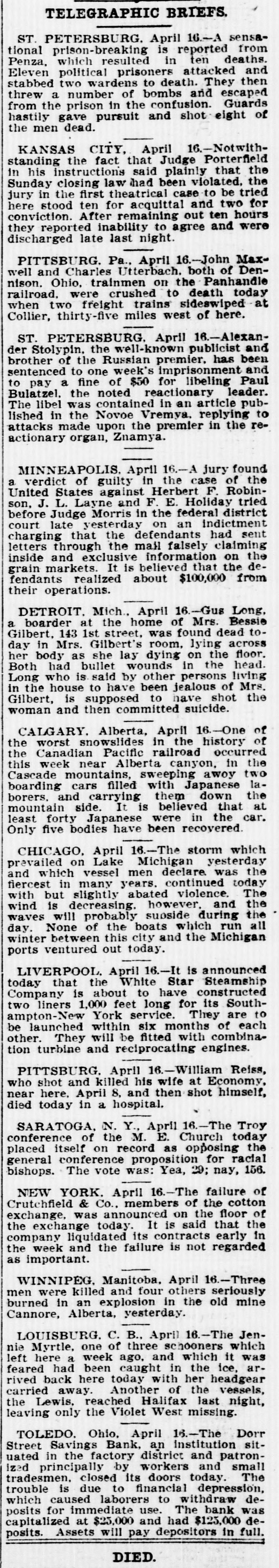 TELEGRAPHIC BRIEFS. ST. PETERSBURG. April 16-A sensational prison-breaking is reported from Penza, which resulted in ten deaths. Eleven political prisoners attacked and stabbed two wardens to death. They then threw a number of bombs and escaped from the prison in the confusion. Guards hastily gave pursuit and shot eight of the men dead. KANSAS CITY, April 16.-Notwithstanding the fact that Judge Porterfield in his instructions said plainly that the Sunday closing law had been violated. the jury in the first theatrical case to be tried here stood ten for acquittal and two for conviction. After remaining out ten hours they reported inability to agree and were discharged late last night. PITTSBURG. Pa., April 16.-John Maxwell and Charles Utterbach. both of Dennison. Ohio, trainmen on the Panhandle railroad. were crushed to death today when two freight trains sideswiped at Collier, thirty-five miles west of here. ST. PETERSBURG. April 16.-Alexander Stolypin. the well-known publicist and brother of the Russian premier. has been sentenced to one week's imprisonment and to pay a fine of $50 for libeling Paul Bulatzel. the noted reactionary leader. The libel was contained in an article published in the Novoe Vremya. replying to attacks made upon the premier in the reactionary organ, Znamya. MINNEAPOLIS. April 16.-A jury found a verdict of guilty in the case of the United States against Herbert F. Robinson, J. L. Layne and F. E. Holiday tried before Judge Morris in the federal district court late yesterday on an indictment charging that the defendants had sent letters through the mail falsely claiming inside and exclusive information on the grain markets. It is believed that the defendants realized about $100,000 from their operations. DETROIT. Mich., April 16.-Gus Long, boarder at the home of Mrs. Bessie a Gilbert, 143 1st street, was found dead today in Mrs. Gilbert's room, lying across her body as she lay dying on the floor. Both had bullet wounds in the head. Long who is said by other persons living in the house to have been jealous of Mrs. Gilbert, is supposed to have shot the woman and then committed suicide. CALGARY. Alberta, April 16.-One of the worst snowslides in the history of the Canadian Pacific railroad occurred this week near Alberta canyon, in the Cascade mountains, sweeping awoy two boarding cars filled with Japanese laborers. and carrying them down the mountain side. It is believed that at least forty Japanese were in the car. Only five bodies have been recovered. CHICAGO, April 16.-The storm which prevailed on Lake Michigan yesterday and which vessel men declare. was the fiercest in many years. continued today with but slightly abated violence. The wind is decreasing. however. and the waves will probably suoside during the day. None of the boats which run all winter between this city and the Michigan ports ventured out today. LIVERPOOL. April 16.-It is announced today that the White Star Steamship Company is about to have constructed two liners 1,000 feet long for its Southampton-New York service. They are to be launched within six months of each other. They will be fitted with combination turbine and reciprocating engines. PITTSBURG. April 16.-William Reiss, who shot and killed his wife at Economy, near here. April 8, and then shot himself, died today in a hospital. SARATOGA, N. Y., April 16.-The Troy conference of the M. E. Church today placed itself on record as opposing the general conference proposition for racial bishops. The vote was: Yea, 29; nay, 156. NEW YORK. April 16.-The failure of Crutchfield & Co., members of the cotton exchange, was announced on the floor of the exchange today. It is said that the company liquidated its contracts early in the week and the failure is not regarded as important. WINNIPEG. Manitoba, April 16.-Three men were killed and four others seriously burned in an explosion in the old mine Cannore, Alberta, yesterday. LOUISBURG. C. B., April 16.-The Jennie Myrtle, one of three schooners which left here a week ago, and which it was feared had been caught in the ice, arrived back here today with her headgear carried away. Another of the vessels, the Lewis, reached Halifax last night, leaving only the Violet West missing. TOLEDO. Ohio, April 16.-The Dorr Street Savings Bank, an institution situated in the factory district and patronized principally by workers and small tradesmen. closed its doors today. The trouble is due to financial depression, which caused laborers to withdraw deposits for immediate use. The bank was capitalized at $25,000 and had $125,000 deposits. Assets will pay depositors in full. DIED.