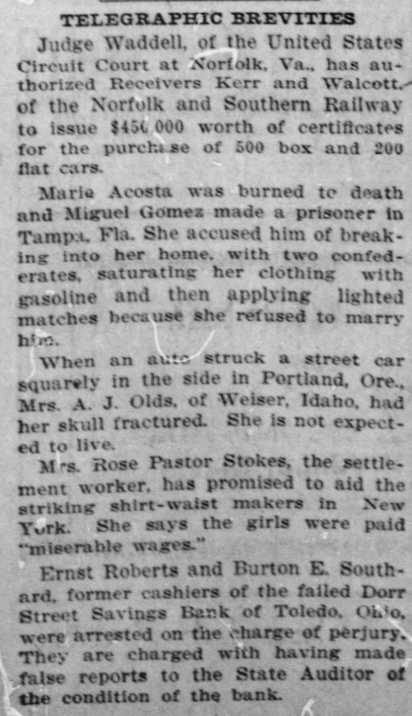 # TELEGRAPHIC BREVITIES Judge Waddell, of the United States Circuit Court at Norfolk, Va., has authorized Receivers Kerr and Walcott, of the Norfolk and Southern Railway to issue $456,000 worth of certificates for the purchase of 500 box and 200 flat cars. Marie Acosta was burned to death and Miguel Gomez made a prisoner in Tampa, Fla. She accused him of breaking into her home, with two confederates, saturating her clothing with gasoline and then applying lighted matches because she refused to marry him. When an auto struck a street car squarely in the side in Portland, Ore., Mrs. A. J. Olds, of Weiser, Idaho, had her skull fractured. She is not expected to live. Mrs. Rose Pastor Stokes, the settlement worker, has promised to aid the striking shirt-waist makers in New York. She says the girls were paid "miserable wages." Ernst Roberts and Burton E. Southard, former cashiers of the failed Dorr Street Savings Bank of Toledo, Ohio, were arrested on the charge of perjury. They are charged with having made false reports to the State Auditor of the condition of the bank.
