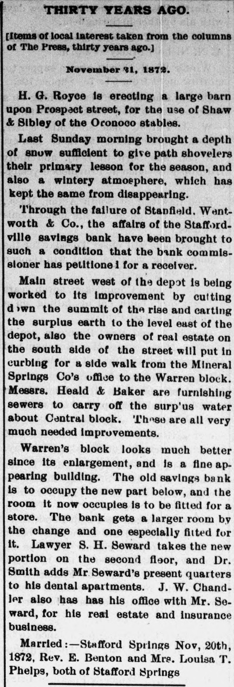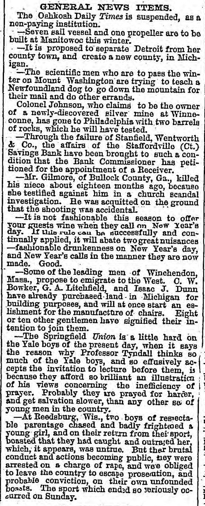 GENERAL NEWS ITEMS. The Oshkosh Daily Times is suspended, as a non-paying institution. -Seven sail vessel and one propeller are to be built at Manitowoc this winter. -It is proposed to separate Detroit from her county town, and create a new county, in Michigan. The scientific men who are to pass the winter on Mount Washington are trying to teach a Newfoundland dog to go down the mountain for their mail and do other errands. Colonel Johnson, who claims to be the owner of a newly-discovered silver mine at Winneconne, has gone to Philadelphia with two barrels of rocks, which he will have tested. -Through the failure of Stanfield, Wentworth & Co., the affairs of the Staffordville (Ct.) Savings Bank have been brought to such a condition that the Bank Commissioner has petitioned for the appointment of a Receiver. -Mr. Gilmore, of Bullock County, Ga., killed his niece about eighteen months ago, because she testified against him in a church scandal investigation. He was acquitted on the ground that the shooting was accidental. -It is not fashionable this season to offer your guests wine when they call on New Year's day. If this rule can be successfully and continually applied, it will abate two great nuisances - fashionable drunkenness on New Year's day, and New Year's calls in the manner they are now made. Good. -Some of the leading men of Winchendon, Mass., propose to emigrate to the West. c. W. Bowker, G. A. Litchfield, and Isaac J. Dunn have already purchased-land-in Michigan for building purposes, and will at once start an establishment for the manufacture of chairs. Eight or ten other gentlemen have signified their intention to join them. -The Springfield Union is a little hard on the Yale boys of the present day, when it says the reason why Professor Tyndall thinks so much of the Yale boys, and so effusively accepts the invitation to lecture before them, is because they afford so brilliant an illustration of his views concerning the inefficiency of prayer. Probably they are prayed for harder, and get salvation slower, than any other set of young men in the country. -At Reedsburg, Wis., two boys of respectable parentage chased and badly frightened a young girl, and on their return from their sport, boasted that they had caught and outraged her, which, it appears, was untrue. But their brutal conduct and actions becoming public, they were arrested on a charge of rape, and were obliged to leave the country to escape prosecution, and probable conviction, on their own unfounded boasts. The sport which ended so seriously occurred on Sunday.
