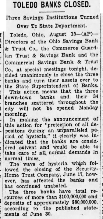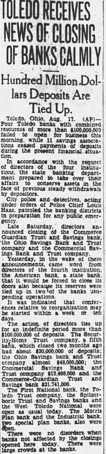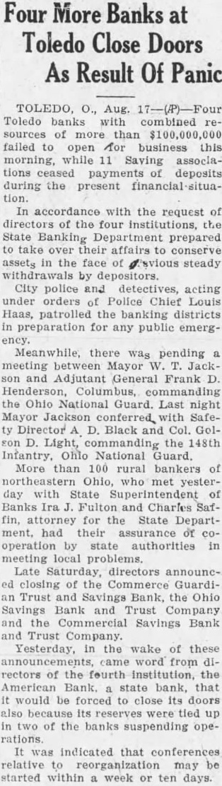 Four More Banks at Toledo Close Doors As Result Of Panic TOLEDO, O., Aug. Toledo of failed open for business this associations deposits during the present financial accordance with the request directors four institutions, the State Banking Department prepared take over affairs to conserve assets the face of svious steady by police and acting under orders Police Chief Louis Haas, patrolled the banking districts in preparation for any public emergency Meanwhile, there was pending meeting between Mayor Jackand Adjutant General Frank Henderson, commanding the Ohio National Guard. Last night SafeD. Black Col. Golson Light, the 148th National Guard. More rural bankers of who met yesterday of Banks Ira Charles Saffor the State Department, had their cooperation authorities in meeting local Late directors announcclosing the GuardiTrust and Bank, the Ohio Savings Trust Company and the Savings Bank and Trust Company. Yesterday, the wake of these came word from rectors of the feurth institution, the American Bank. state bank, that would be forced to close its doors its reserves tied up of the banks suspending operations. was indicated that conferences relative may be started within week or ten days.