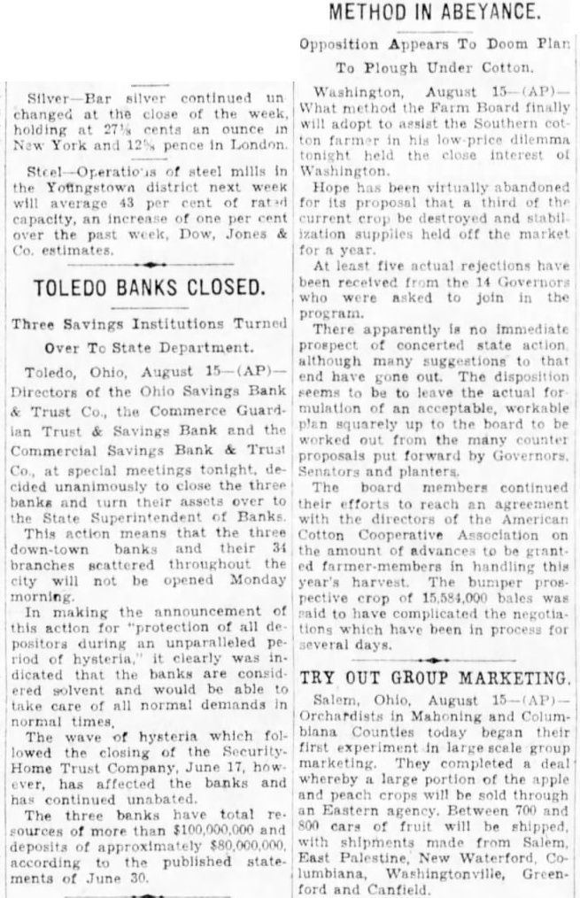 Silver Bar silver continued un changed at the close of the week holding at 27% an ounce New York and 12% pence in London Washington, August 15the Farm Board finally will adopt to the Southern cot farmer his low dilemma tonight the close interest of toel-Operations of steel mills in Washington the Youngstown district next week Hope been virtually abandoned will average per cent of rated for its proposal that third of the an increase of one per cent current crop be destroyed and over the past week, Dow, Jones & ization supplies held off the market Co. estimates. for year At least five actual rejections been received the Governors TOLEDO BANKS CLOSED. who were asked to join in the program. Three Savings Institutions Turned There apparently is no immediate Over To State Department. prospect of action although many to that Toledo, Ohio, August end have out. The disposit Directors of the Ohio Savings Bank seems be to leave the actual for & Trust Co., the Guard plan squarely up to the board to be Trust & Savings Bank and the worked out the counter Commercial Savings Bank & Trust proposals put forward by Governors. Co., at special meetings tonight. de- Senators and cided to close the three board members continued banks and turn their assets their efforts to reach an agreement the State Superintendent of Banks with the directors the American This action means that the three Cotton Cooperative Association on down-town banks and their 34 the amount advances to be branches throughout the ed in handling this city not be opened Monday year's The bumper morning pective crop 15,584,000 In the of said the this action for protection of all de- tions have been in process for during an unparalleled several days. TRY OUT GROUP MARKETING Salem, Ohio, August Orchardists Mahoning and Columbiana Counties today began their first in group marketing. They completed deal whereby large of the apple and peach will be sold an agency 700 and 800 cars of fruit will be shipped with East Palestine New Coford and Canfield
