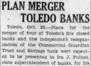 PLAN MERGER TOLEDO BANKS Toledo, Oct. for the merger four of Toledo's five closed banks and the independent reorganization of the Guardian Trust and Savings bank expected to presented to Ira Fulton, superintendent banks, for his