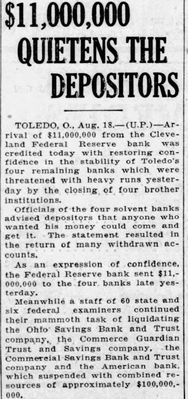 $11,000,000 QUIETENS THE DEPOSITORS TOLEDO. rival of from the Cleveland Federal Reserve bank was credited today with restoring confidence stability four remaining banks which were heavy runs yesterday by the closing of four brother institutions. Officials the four solvent banks advised that anyone wanted his could come and The statement resulted in the of withdrawn acreturn many counts. As an expression of confidence, the Federal Reserve bank sent $11,to the four banks late yesterday. Meanwhile staff of 60 state and six federal continued their of liquidating the Ohio Bank and Trust the Guardian Trust and Savings company, the Bank Trust the American company with sources of approximately 000.