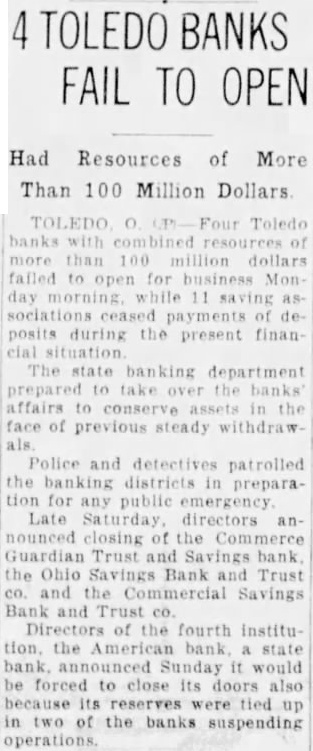 TOLEDO BANKS FAIL TO OPEN Had Resources of More Than 100 Million Dollars TOLEDO banks combined of more than 100 million dollars to open for business day while 11 saving sociations ceased payments of posits during the present cial The state banking department prepared the banks affairs to conserve in face of previous steady withdraw. Police and detectives patrolled the banking districts in preparation for any public emergency Late Saturday, directors announced closing of the Guardian Trust and Savings bank the Ohio Savings Bank and Trust CO. and the Commercial Savings Bank and Trust co. Directors of the fourth institution, the American bank state bank Sunday it would be forced to close its doors also because its reserves were tied up in two of the banks suspending