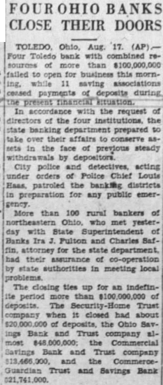 FOUR OHIO BANKS CLOSE THEIR DOORS TOLEDO, Ohio, Aug. 17. (AP). Four Toledo bank with combined resources of more than $100,000,000 failed open for business this mornwhile 11 saving associations payments of deposits during the present financial In accordance with the request of directors of the four institutions, the state department prepared to take over affairs to conserve assets in the face of previous steady withdrawals by depositors. City police and detectives, acting under orders of Police Chief Louis Haas, patroled the banking districts in preparation for any public emergency. More than 100 rural bankers of who met yesterday with Superintendent of Banks Ira Fulton and Charles Saf fin. attorney for the state department, had their assurance of co-operation by state authorities in meeting local The closing ties up for an indefinite period more than of deposits. The Trust company when it closed had about of the Ohio Savings Bank and Trust company almost Commercial Savings Bank and Trust company Guardian Trust and Savings Bank
