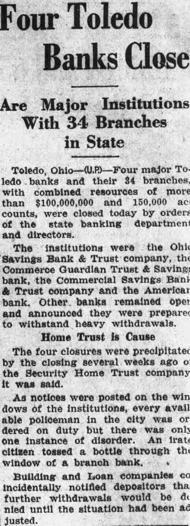 Four Toledo Banks Are Institutions Major With 34 Branches in State Toledo, major ledo banks and their 34 branches, with combined resources of more than and counts, were today by orders the state banking department and directors. The institutions were the Ohio Savings Bank Trust Guardian Trust bank, the Commercial Bank Trust and the bank. Other banks oper and announced they were to withstand heavy withdrawals. Home Trust is Cause The four closures were precipitated the closing several weeks ago the Security Home Trust company was said. As notices were posted on the dows the every avail able in the city was or dered on duty but there only one of disorder. An trate citizen tossed bottle through the window of a branch bank. Building and Loan companies incidentally notified depositors tha further withdrawals would be nied until the situation had been ad justed.