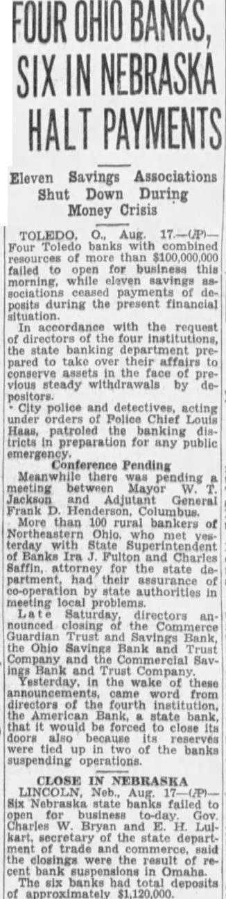FOUR OHIO BANKS, SIX IN NEBRASKA HALT PAYMENTS Eleven Savings Associations Shut Down During Money Crisis Four Toledo banks combined of more than $100,000,000 failed to open for business this morning, while eleven savings sociations ceased payments of posits during the present financial In accordance with the request the four institutions, the state department pared to take over their affairs to conserve assets in the face of previous steady withdrawals by depositors. City police and detectives, acting orders Chief Louis Haas, patroled the banking districts in preparation for any public emergency Conference Pending Meanwhile there was pending meeting between Mayor W. Jackson and Adjutant General Frank Columbus. More than 100 rural bankers of who met terday with State yes. of Banks Ira Fulton and Charles Saffin, attorney for the state department, had their assurance co-operation by state authorities in meeting Late Saturday directors announced closing of the Guardian Trust and Savings Bank, the Ohio Savings Bank Trust Company and Commercial SavBank and Trust Company Yesterday, in the wake of these came word from directors of the fourth the American Bank, state bank, that it would be forced to close doors also because its reserves were tied up in two of the banks suspending operations. CLOSE IN NEBRASKA LINCOLN, Neb., Aug. Six Nebraska state banks failed to for business to-day. Gov Charles W. Bryan and E. H. Luisecretary of the state department of trade and said the closings were the result of rebank suspensions in Omaha. The six banks had total deposits of approximately $1,120,000