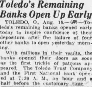 Toledo's Remaining Banks Open Up Early TOLEDO, O., Aug. ledo's remaining banks opened early today to inspire confidence of their depositors after the failure of four other banks to open yesterday morn- With millions their the opened as the first trickle of peared. Toledo Company and the National bank openhour and half before the customary time