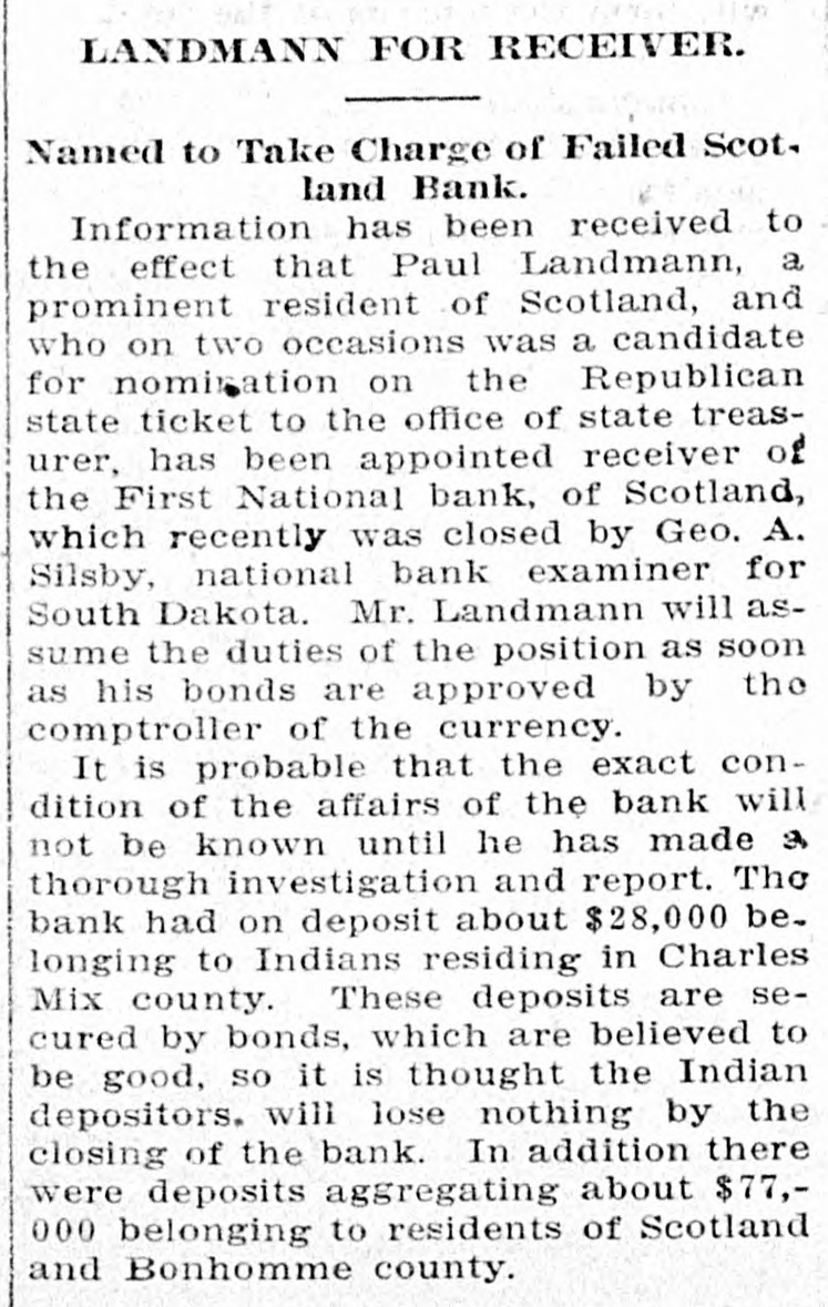 Paul Landmann ... has been appointed receiver of the First National bank, of Scotland, which recently was closed by Geo. A. Silsby, national bank examiner for South Dakota.