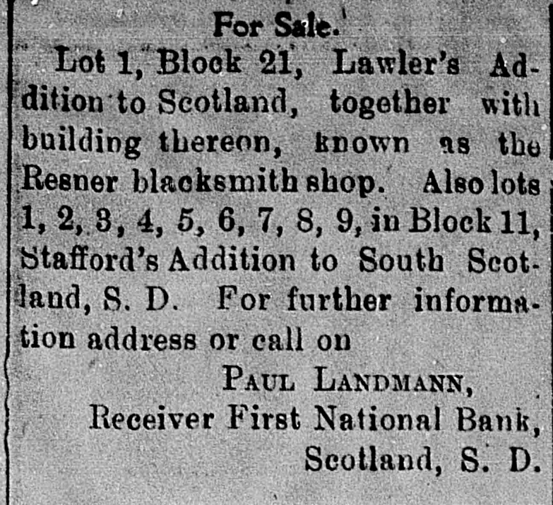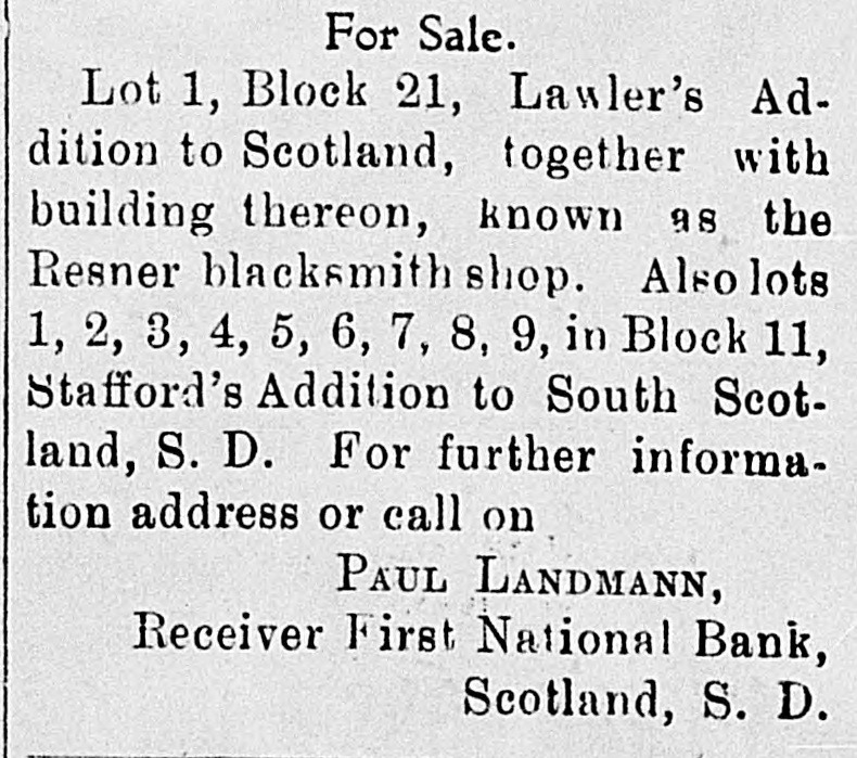 For Sale. Lot 1, Block 21, Lawler's Addition to Scotland, together with building thereon, known as the Resner blacksmith shop. Also lots 1, 2, 3, 4, 5, 6, 7, 8, 9, in Block 11, Stafford's Addition to South Scotland, S. D. For further information address or call on PAUL LANDMANN, Receiver First National Bank, Scotland, S. D.