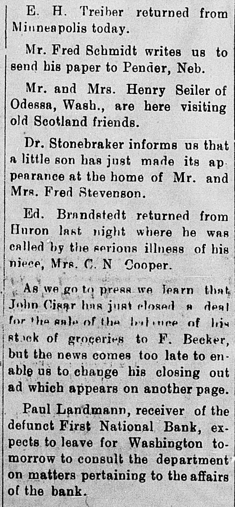 E. H. Treiber returned from Minneapolis today. Mr. Fred Schmidt writes us to send his paper to Pender, Neb. Mr. and Mrs. Henry Seiler of Odessa, Wash., are here visiting old Scotland friends. Dr. Stonebraker informs us that a little son has just made its appearance at the home of Mr. and Mrs. Fred Stevenson. Ed. Brandstedt returned from Huron last night where he was called by the serious illness of his niece, Mrs. C. N Cooper. As we go to press we Tearn that John Cisar has just closed A deal for the sale of the beforee of his st ok of groceries to F. Becker, but the news comes too late to enable us to change his closing out ad which appears on another page. Paul Landmann, receiver of the defunct First National Bank, expects to leave for Washington tomorrow to consult the department on matters pertaining to the affairs of the bank.