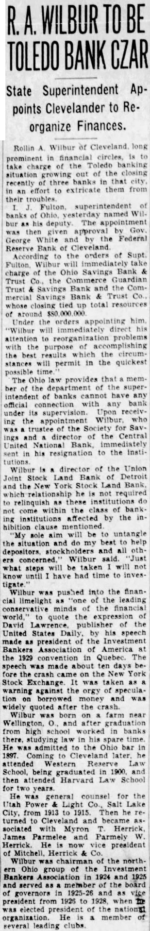 Rollin A. Wilbur of Cleveland long prominent in financial circles, is to take of the Toledo banking charge situation out of the closing growing recently three banks in that city, in an effort to extricate them from their Fulton. superintendent of banks of Ohio. yesterday named Wilbur as his deputy The was then given approval by Gov. George White and by the Federal Reserve Bank of Cleveland According to orders of Supt. Fulton Wilbur will immediately take of the Ohio Savings Bank charge Trust Co., the Commerce Guardian Trust Savings Bank and the Commercial Savings Bank & Trust Co. whose closing tied up total resources of around Under the orders appointing will immediately direct his attention to reorganization problems with the purpose of best results the circumthe stances will permit in the quickest possible time The Ohio law provides that member the department of the of intendent of banks cannot have any official connection with any bank under its supervision. Upon receiving the appointment the for ings and director of the Central United Bank, immediately sent in his resignation to the InstiWilbur is director of the Union Joint Stock Land Bank of Detroit and the New York Stock Land Bank he not required to relinquish do not come the class of bank. ing institutions affected by the inhibition clause 'My sole aim will be to untangle the situation and do my best to help ers concerned. Wilbur said Just what steps will be taken will not know until have had time to investigate Wilbur was pushed into the financial limelight as of the leading conservative minds of the financial world quote the expression of David Lawrence publisher of the United States Daily by his speech made as president of the Investment Bankers Association of America at the 1929 convention in Quebec. The speech was made about ten days before the crash came on the New York Stock Exchange It was taken as warning against the orgy of speculation borrowed money and was widely quoted after the crash. Wilbur born on farm near Wellington, O., and after graduation from high school worked in banks there. studying law in his spare time. He was admitted to the Ohio bar 1897. Coming to later he attended Reserve Law School, being graduated in 1900. and then attended Harvard Law School for two He was general counsel for the Utah Power Light Co. Salt Lake City, from 1913 to 1915. Then he returned to and as. sociated with Herrick James Parmelee and Parmely W. Herrick. He now vice president of Mitchell, Herrick & Co. Wilbur was chairman of the northern Ohio group of the Investment Bankers Association in 1924 and 1925 and served as a member of the board of governors in 1925-26 and as vice president from 1926 to 1928, when me was elected president of the national He a member of several leading clubs.
