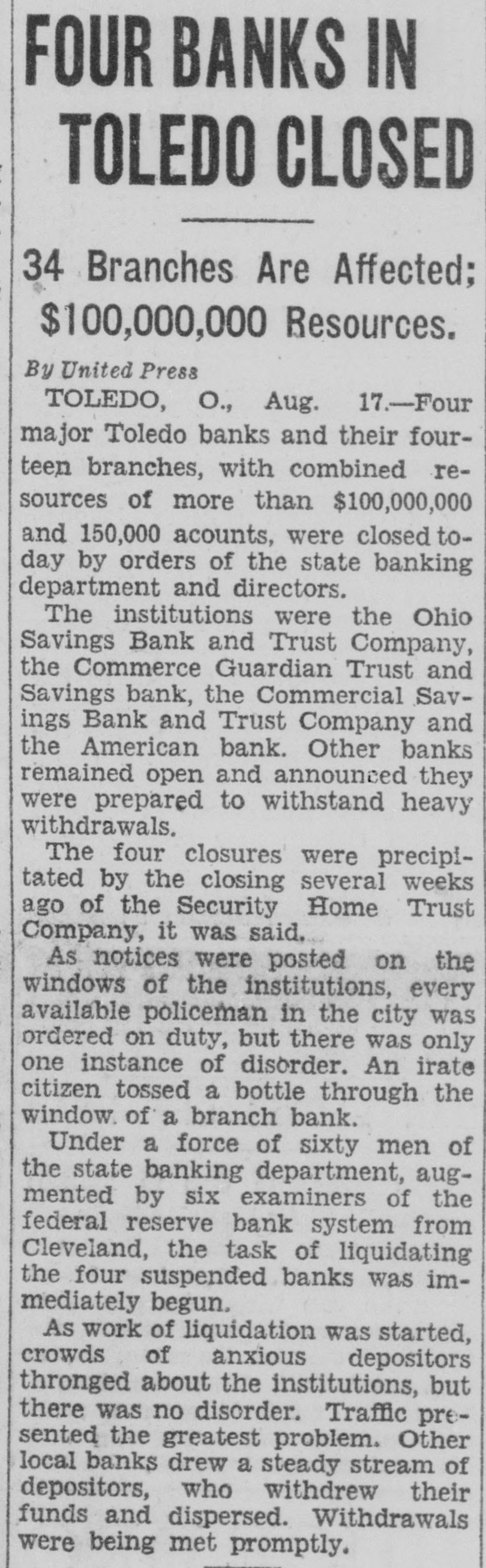 FOUR BANKS IN TOLEDO CLOSED 34 Branches Are Affected; $100,000,000 Resources. By United Press TOLEDO, O., Aug. 17.-Four major Toledo banks and their fourteen branches, with combined resources of more than $100,000,000 and 150,000 acounts, were closed today by orders of the state banking department and directors. The institutions were the Ohio Savings Bank and Trust Company, the Commerce Guardian Trust and Savings bank, the Commercial Savings Bank and Trust Company and the American bank. Other banks remained open and announced they were prepared to withstand heavy withdrawals. The four closures were precipitated by the closing several weeks ago of the Security Home Trust Company, it was said. As notices were posted on the windows of the institutions, every available policeman in the city was ordered on duty, but there was only one instance of disorder. An irate citizen tossed a bottle through the window. of a branch bank. Under a force of sixty men of the state banking department, augmented by six examiners of the federal reserve bank system from Cleveland, the task of liquidating the four suspended banks was immediately begun. As work of liquidation was started, crowds of anxious depositors thronged about the institutions, but there was no disorder. Traffic presented the greatest problem. Other local banks drew a steady stream of depositors, who withdrew their funds and dispersed. Withdrawals were being met promptly.