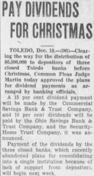 TOLEDO, Dec. the way for the distribution of $6,500,000 depositors of three closed Toledo banks before Christmas, Common Pleas Judge Martin today approved the plans for dividend payments arranged by banking officials, per cent dividend payment be made the Commercial Savings Bank Trust Company, and cent dividends paid by the Ohio Savings Bank Trust Company, the Home Trust Company, it anPayment of the dividends by the three closed banks, which recently abandoned plans for consolidating single institution because support from begin next