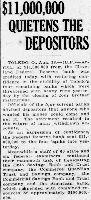 $11,000,000 QUIETENS THE DEPOSITORS of from the Cleveland was credited today with confidence in stability of Toledo's four banks which were yesterby the closing of four brother Officials the four solvent banks advised depositors that anyone wanted his money could come and get The statement resulted in the of many withdrawn acexpression of the Federal bank sent 000,000 to the four banks late yesterday. Meanwhile staff of 60 state and federal examiners continued their task of liquidating the Ohio Savings Bank Trust company, the Commerce Guardian Trust and Savings company, the Commercial Savings Bank and Trust company and the American bank, which of approximately $100,000,000.