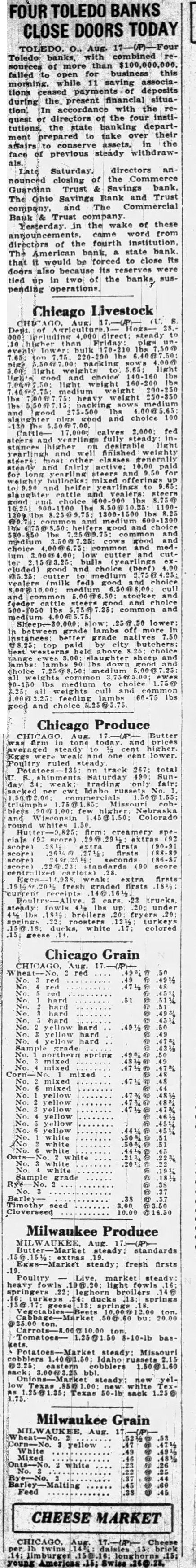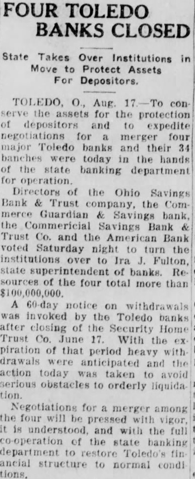 TOLEDO, Ohio, Aug. 17. (AP). Four Toledo bank with combined resources of more than $100,000,000 failed open for business this mornwhile 11 saving associations payments of deposits during the present financial In accordance with the request of directors of the four institutions, the state department prepared to take over affairs to conserve assets in the face of previous steady withdrawals by depositors. City police and detectives, acting under orders of Police Chief Louis Haas, patroled the banking districts in preparation for any public emergency. More than 100 rural bankers of who met yesterday with Superintendent of Banks Ira Fulton and Charles Saf fin. attorney for the state department, had their assurance of co-operation by state authorities in meeting local The closing ties up for an indefinite period more than of deposits. The Trust company when it closed had about of the Ohio Savings Bank and Trust company almost Commercial Savings Bank and Trust company Guardian Trust and Savings Bank