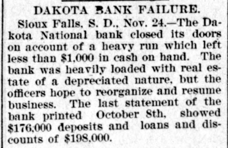 The Dakota National Bank ... failed to open its doors this morning, owing to heavy withdrawals of deposits last Saturday, when $39,000 was taken out.