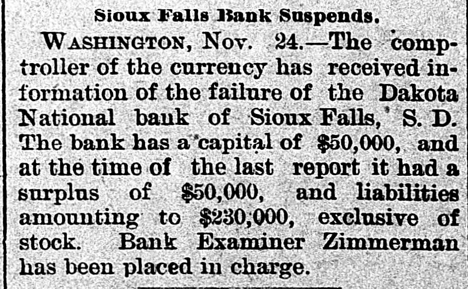 The comptroller of the currency has received information of the failure of the Dakota National Bank ... Bank Examiner Zimmerman has been placed in charge. Later reports refer to Zimmerman as receiver and dividends declared in 1897 by the Comptroller's office.