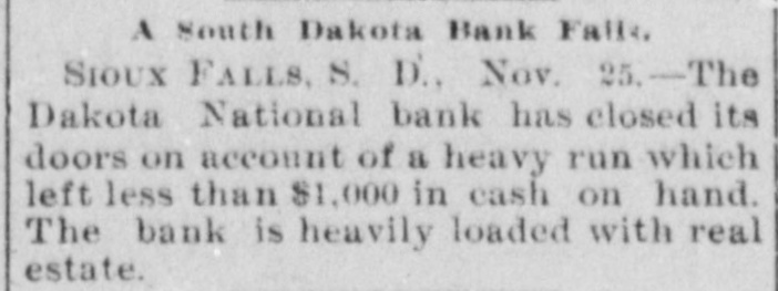 Suspension Followed a Run. Sioux FALLS, S. D., Nov. 25.-The Dakota National bank has closed its doors on account of a heavy run, which left less than $1,000 in cash on hand. The bank is heavily loaded with real estate of a depreciated nature, but the officers hope to reorganize and resume business. The last statement of the bank, printed Oct. 8, showed $176,000 deposits, and loans and discounts of $198,000.