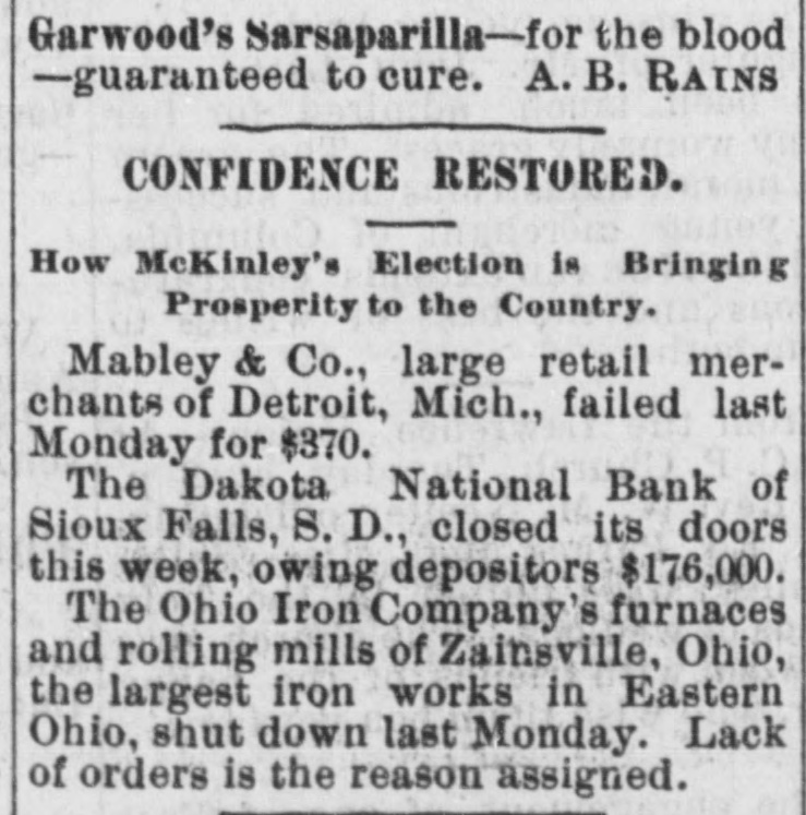 Garwood's Sarsaparilla-for the blood - -guaranteed to cure. A. B. RAINS CONFIDENCE RESTORED. How McKinley's Election is Bringing Prosperity to the Country. Mabley & Co., large retail merchants of Detroit, Mich., failed last Monday for $370. The Dakota National Bank of Sioux Falls, S. D., closed its doors this week, owing depositors $176,000. The Ohio Iron Company's furnaces and rolling mills of Zainsville, Ohio, the largest iron works in Eastern Ohio, shut down last Monday. Lack of orders is the reason assigned.