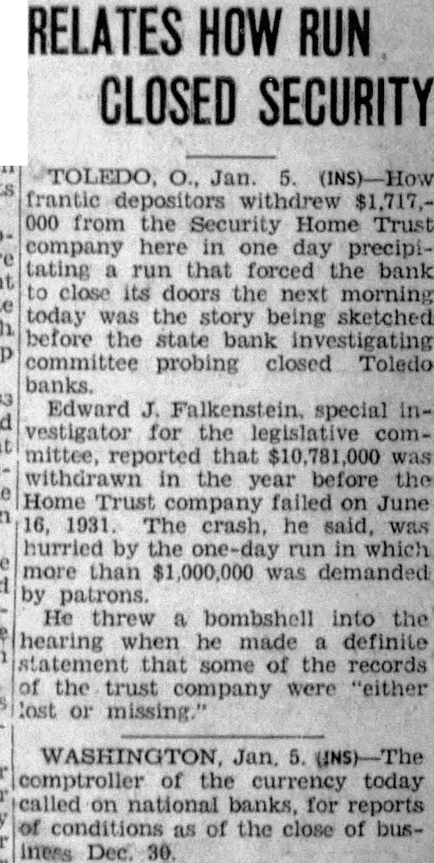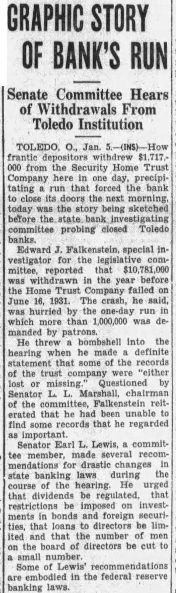 GRAPHIC BANK'S RUN Senate Committee Hears of Withdrawals From Toledo Institution O., frantic $1,717.000 from the Security Home Trust Company here in day, precipitating forced the bank to the next morning, today was the being sketched before the state bank committee probing closed Toledo banks. Edward Falkenstein, special vestigator the legislative mittee, reported that $10,781,000 withdrawn the year before the Home Trust Company failed on June 16, 1931. crash, said, hurried one-day run which more 1,000,000 was manded by He bombshell into the hearing when he made definite that some the records of the trust were "either lost or Questioned by Marshall, of the reitthat he had been unable find some records that he regarded Senator Lewis, committee member, made recommendations for drastic changes laws during the state of the hearing He urged that be regulated, that be on investments bonds and foreign securities, loans directors be limited that number of men on the board of directors be cut small number. Some of recommendations are embodied in the federal reserve banking laws.
