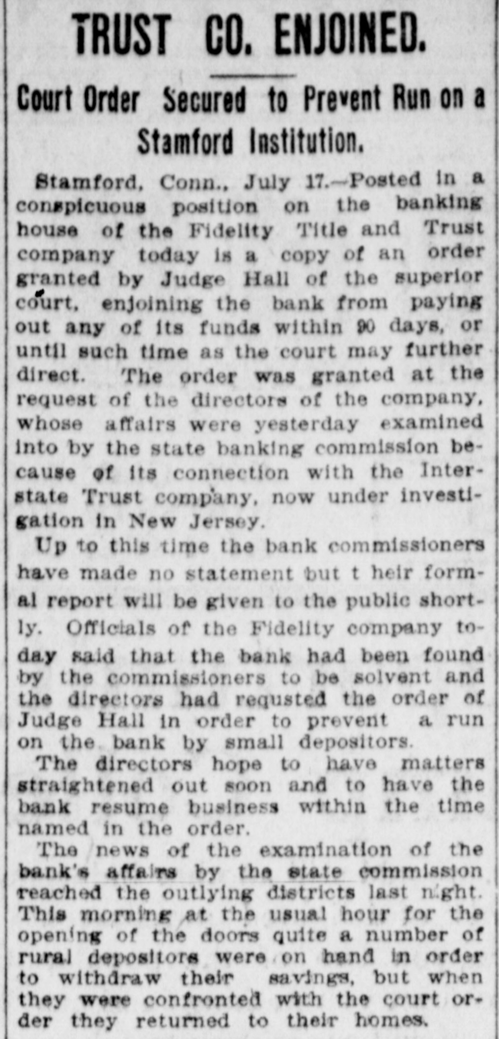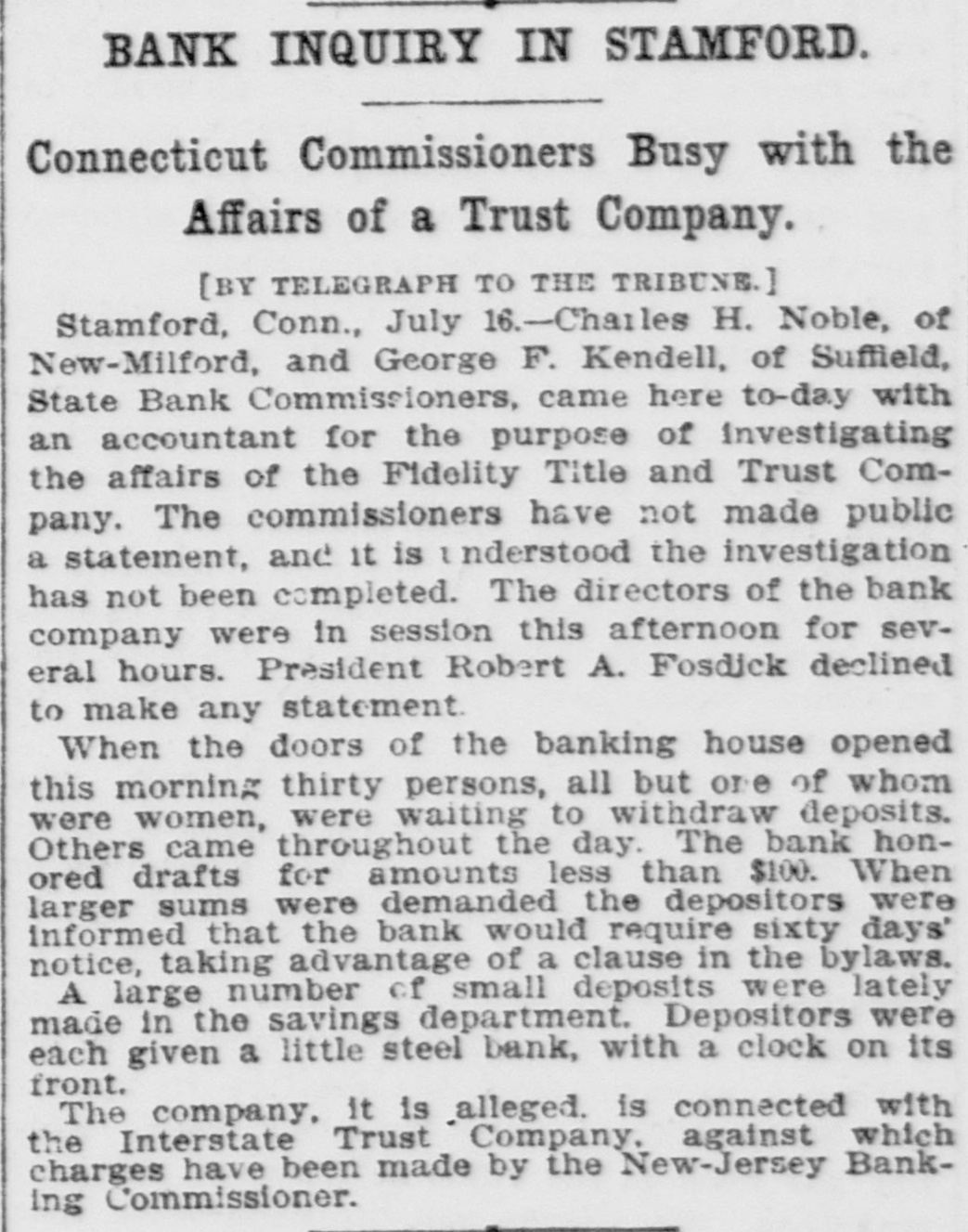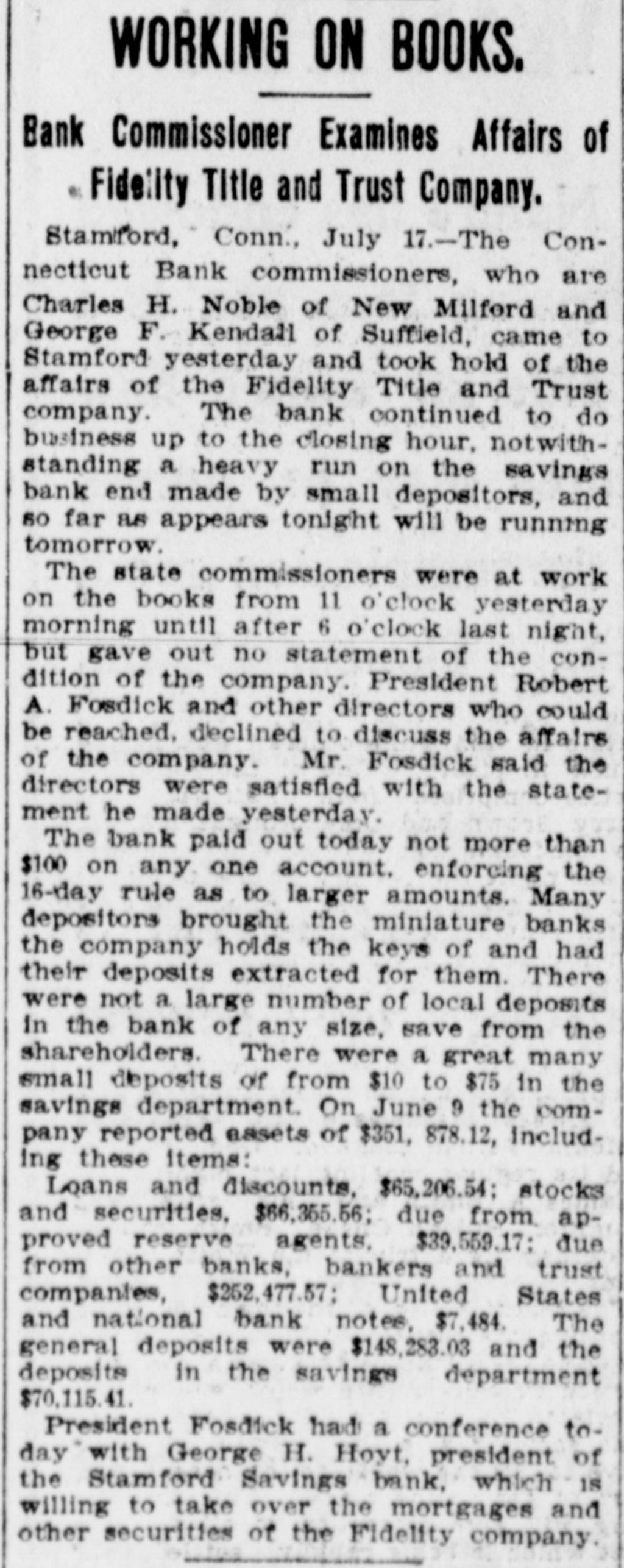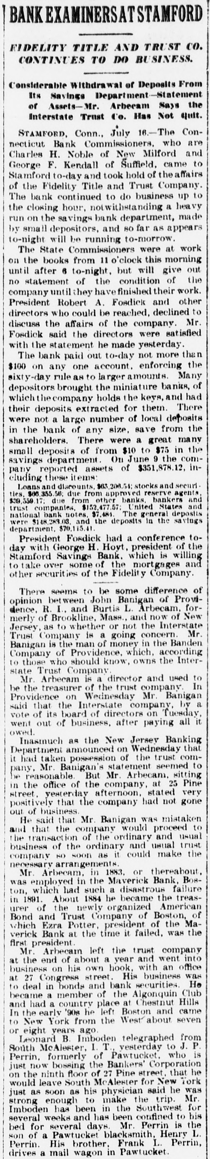 BANK EXAMINERSATSTAMFORD FIDELITY TITLE AND TRUST co. CONTINUES TO DO BUSINESS. Considerable Withdrawal of Deposits From Its Savings Department-Statement of Assets-Mr. Arbecam Says the Interstate Trust Co. Has Not quit. STAMFORD, Conn., July 16.-The Connecticut Bank Commissioners. who are Charles H. Noble of New Milford and George F. Kendall of Suffield. came to Stamford to-day and took hold of the affairs of the Fidelity Title and Trust Company. The bank continued to do business up to the closing hour, notwithstanding a heavy run on the savings bank department, made by small depositors, and so far as appears to-night will be running to-morrow. The State Commissioners were at work on the books from 11 o'clock this morning until after 6 to-night, but will give out no statement of the condition of the company until they have finished their work. President Robert A. Fosdick and other directors who could be reached, declined to discuss the affairs of the company. Mr. Fosdick said the directors were satisfied with the statement he made yesterday. The bank paid out to-day not more than $100 on any one account. enforcing the sixty-day rule as to larger amounts. Many depositors brought the miniature banks, of which the company holds the keys, and had their deposits extracted for them. There were not a large number of local deposits in the bank of any size, save from the shareholders. There were a great many small deposits of from $10 to $75 in the savings department. On June 9 the company reported assets of $351,878.12. including these items: Loans and discounts. $63,208.54 stocks and securities, $66,355.50; due from approved reserve agents. $39,559.17: due from other banks, bankers and trust companies. $152,477.57; United States and national bank notes. $7,484. The general deposits were $148,283.03. and the deposits in the savings department, $70,115.41. President Fosdick had a conference today with George H. Hoyt, president of the Stamford Savings Bank. which is willing to take over some of the mortgages and other securities of the Fidelity Company. There seems to be some difference of opinion between John Banigan of Providence. R. I., and Burtis L. Arbecam. formerly of Brookline, Mass., and now of New Jersey, as to whether or not the Interstate Trust Company is a going concern. Mr. Banigan is the man of money in the Banden Company of Providence, which, according to those who should know, owns the Interstate Trust Company. Mr. Arbecam is a director and used to be the treasurer of the trust company. In Providence on Wednesday Mr. Banigan said that the Interstate company, by a vote of its board of directors on Tuesday, went out of business, after paying all it owed. Inasmuch as the New Jersey Banking Department announced on Wednesday that it had taken possession of the trust company, Mr. Banigan's statement seemed to be reasonable. But Mr. Arbecam. sitting in the office of the company, at 25 Pine street, yesterday afternoon, stated very positively that the company had not gone out of business. He said that Mr. Banigan was mistaken and that the company would proceed to the transaction of the ordinary and usual business of the ordinary and usual trust company SO soon as it could make the necessary arrangements. Mr. Arbecam, in 1883, or thereabout. was employed in the Maverick Bank, Boston, which had such a disastrous failure in 1891. About 1884 he became the treasurer of the newly organized American