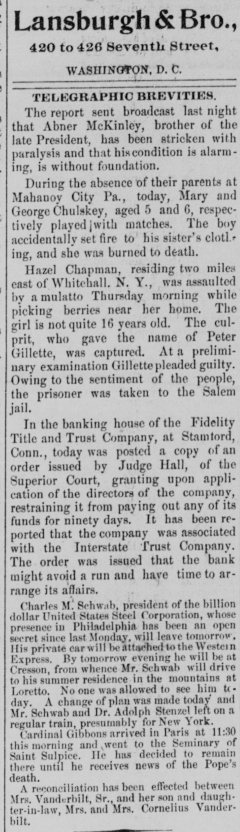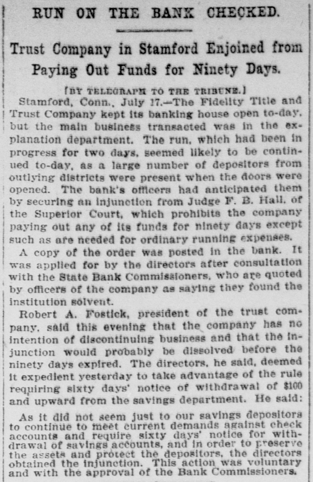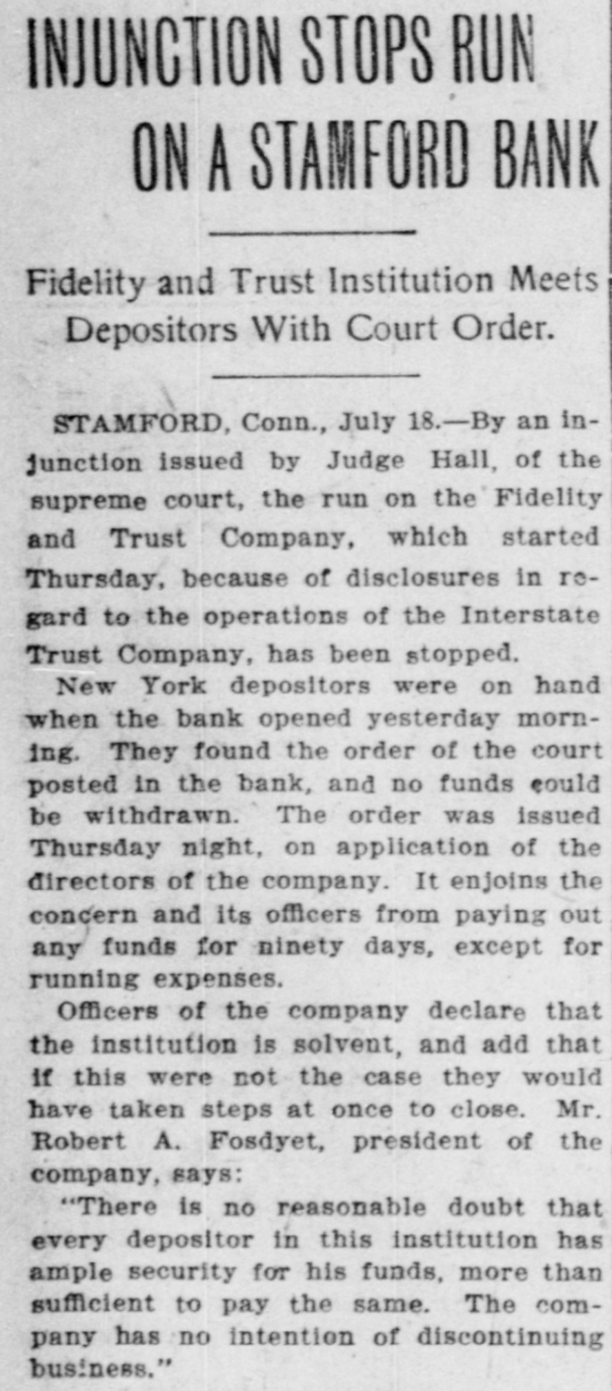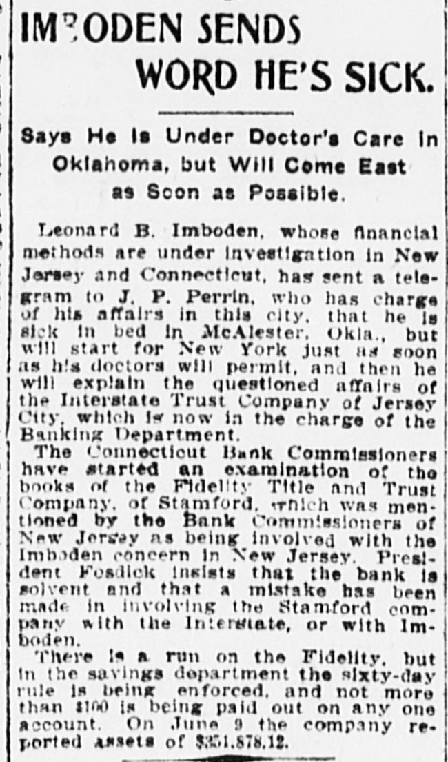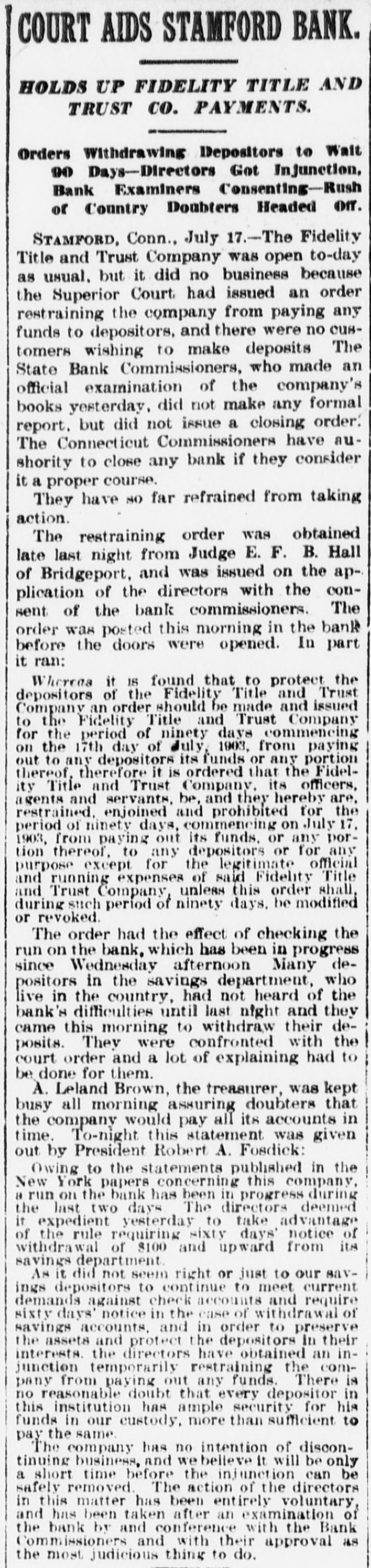 BANK EXAMINERSATSTAMFORD FIDELITY TITLE AND TRUST co. CONTINUES TO DO BUSINESS. Considerable Withdrawal of Deposits From Its Savings Department-Statement of Assets-Mr. Arbecam Says the Interstate Trust Co. Has Not quit. STAMFORD, Conn., July 16.-The Connecticut Bank Commissioners. who are Charles H. Noble of New Milford and George F. Kendall of Suffield. came to Stamford to-day and took hold of the affairs of the Fidelity Title and Trust Company. The bank continued to do business up to the closing hour, notwithstanding a heavy run on the savings bank department, made by small depositors, and so far as appears to-night will be running to-morrow. The State Commissioners were at work on the books from 11 o'clock this morning until after 6 to-night, but will give out no statement of the condition of the company until they have finished their work. President Robert A. Fosdick and other directors who could be reached, declined to discuss the affairs of the company. Mr. Fosdick said the directors were satisfied with the statement he made yesterday. The bank paid out to-day not more than $100 on any one account. enforcing the sixty-day rule as to larger amounts. Many depositors brought the miniature banks, of which the company holds the keys, and had their deposits extracted for them. There were not a large number of local deposits in the bank of any size, save from the shareholders. There were a great many small deposits of from $10 to $75 in the savings department. On June 9 the company reported assets of $351,878.12. including these items: Loans and discounts. $63,208.54 stocks and securities, $66,355.50; due from approved reserve agents. $39,559.17: due from other banks, bankers and trust companies. $152,477.57; United States and national bank notes. $7,484. The general deposits were $148,283.03. and the deposits in the savings department, $70,115.41. President Fosdick had a conference today with George H. Hoyt, president of the Stamford Savings Bank. which is willing to take over some of the mortgages and other securities of the Fidelity Company. There seems to be some difference of opinion between John Banigan of Providence. R. I., and Burtis L. Arbecam. formerly of Brookline, Mass., and now of New Jersey, as to whether or not the Interstate Trust Company is a going concern. Mr. Banigan is the man of money in the Banden Company of Providence, which, according to those who should know, owns the Interstate Trust Company. Mr. Arbecam is a director and used to be the treasurer of the trust company. In Providence on Wednesday Mr. Banigan said that the Interstate company, by a vote of its board of directors on Tuesday, went out of business, after paying all it owed. Inasmuch as the New Jersey Banking Department announced on Wednesday that it had taken possession of the trust company, Mr. Banigan's statement seemed to be reasonable. But Mr. Arbecam. sitting in the office of the company, at 25 Pine street, yesterday afternoon, stated very positively that the company had not gone out of business. He said that Mr. Banigan was mistaken and that the company would proceed to the transaction of the ordinary and usual business of the ordinary and usual trust company SO soon as it could make the necessary arrangements. Mr. Arbecam, in 1883, or thereabout. was employed in the Maverick Bank, Boston, which had such a disastrous failure in 1891. About 1884 he became the treasurer of the newly organized American